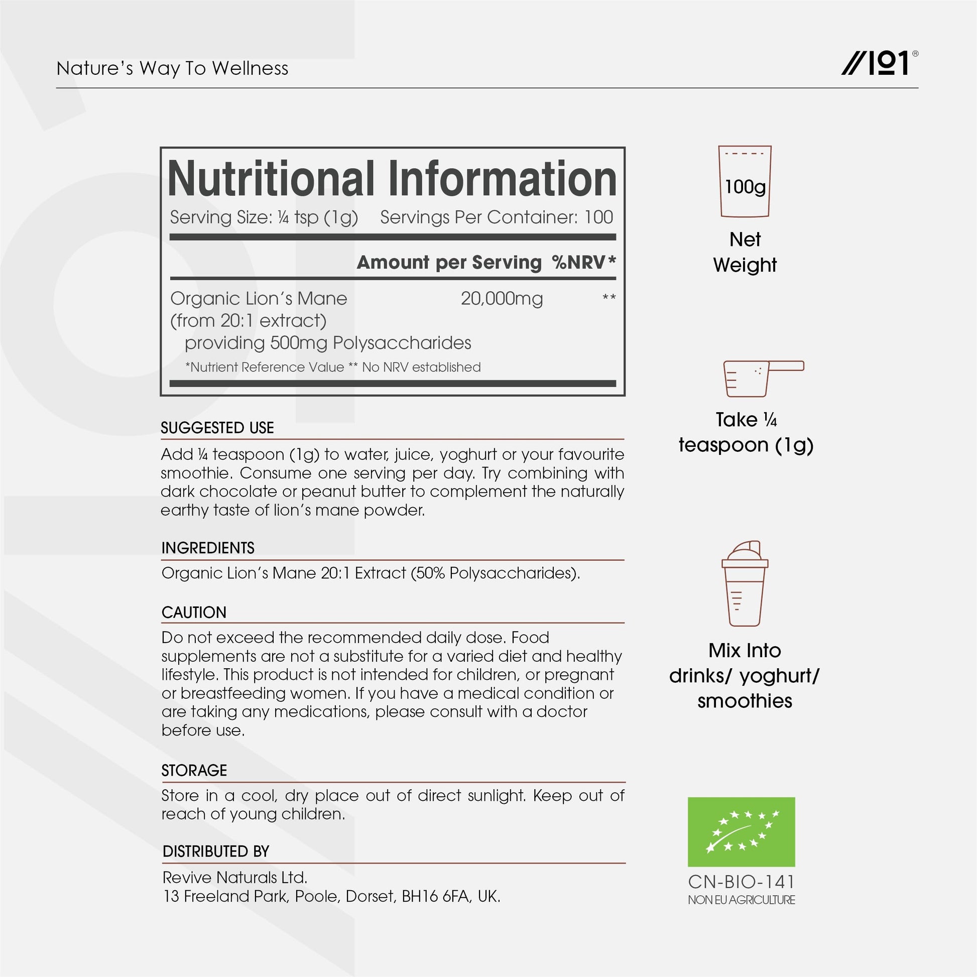 Organic Lions Mane Supplement Extract Powder 100g – 50% Polysaccharides (500mg per Serving) – 100 Days Supply – Resealable and Recyclable Pouch – by Alpha01