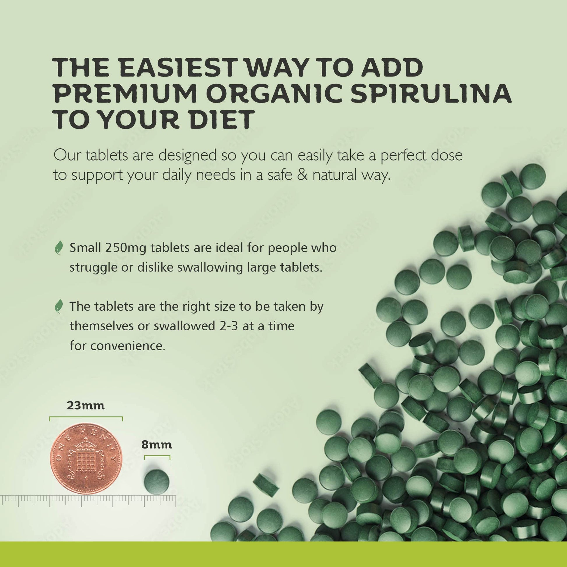 Organic Spirulina tablets - Rich in essential vitamins and minerals. Small easy to swallow 100% pure tablets to support your daily nutritionMore Info