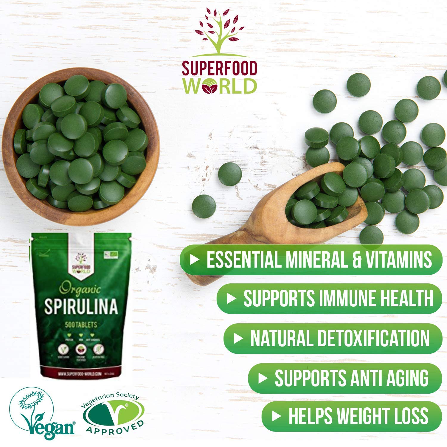 - TESTED & CERTIFIED FOR MAXIMUM RESULTS: Stop wasting money on unreliable, questionable products and get equipped with the best, 100% natural, Organic Certified Spirulina nutritional supplement that you can trust. Packaged and third party tested in the UK under the highest quality standards to ensure purity, Superfood World is your top choice for pure, organic health and wellness supplements with results that you can feel.