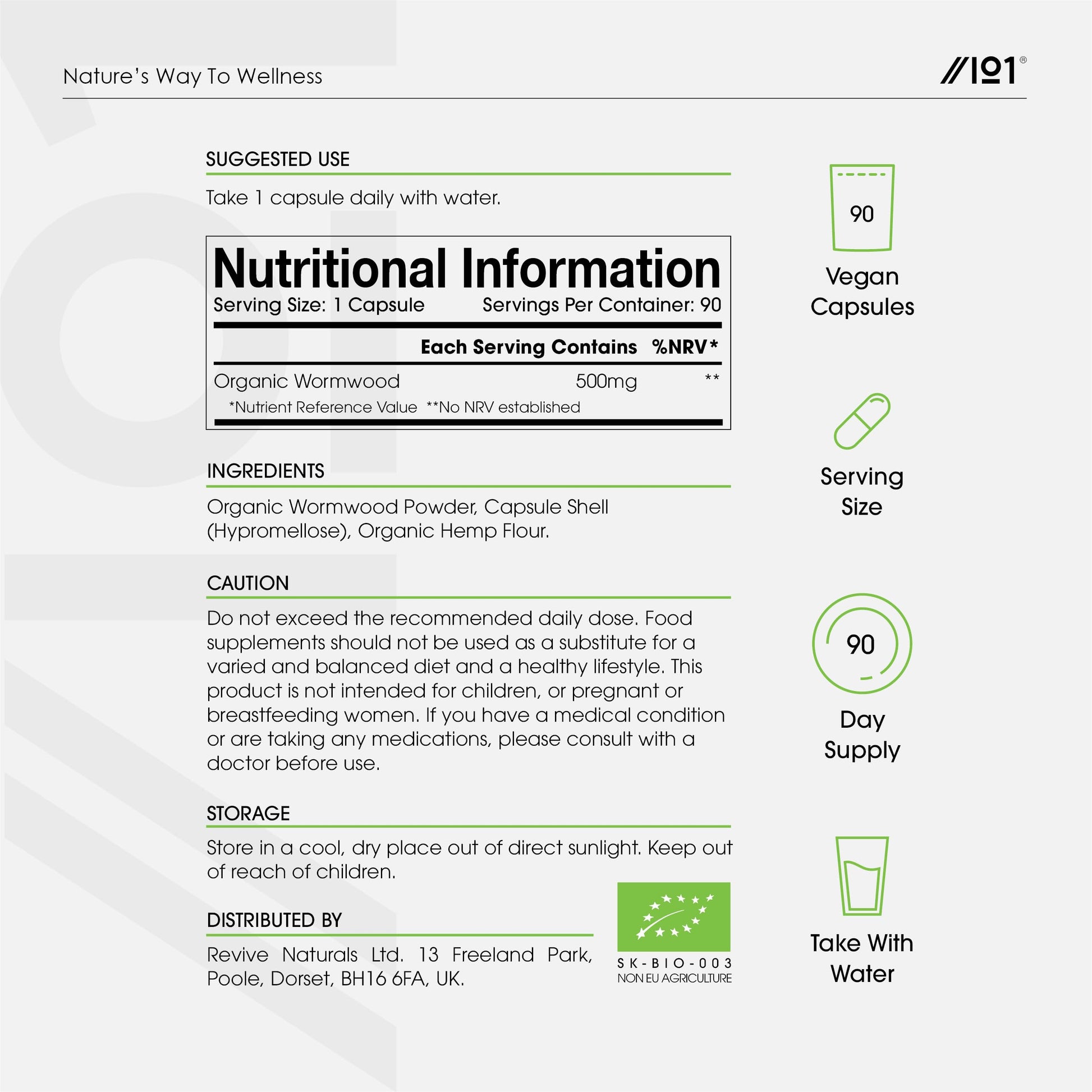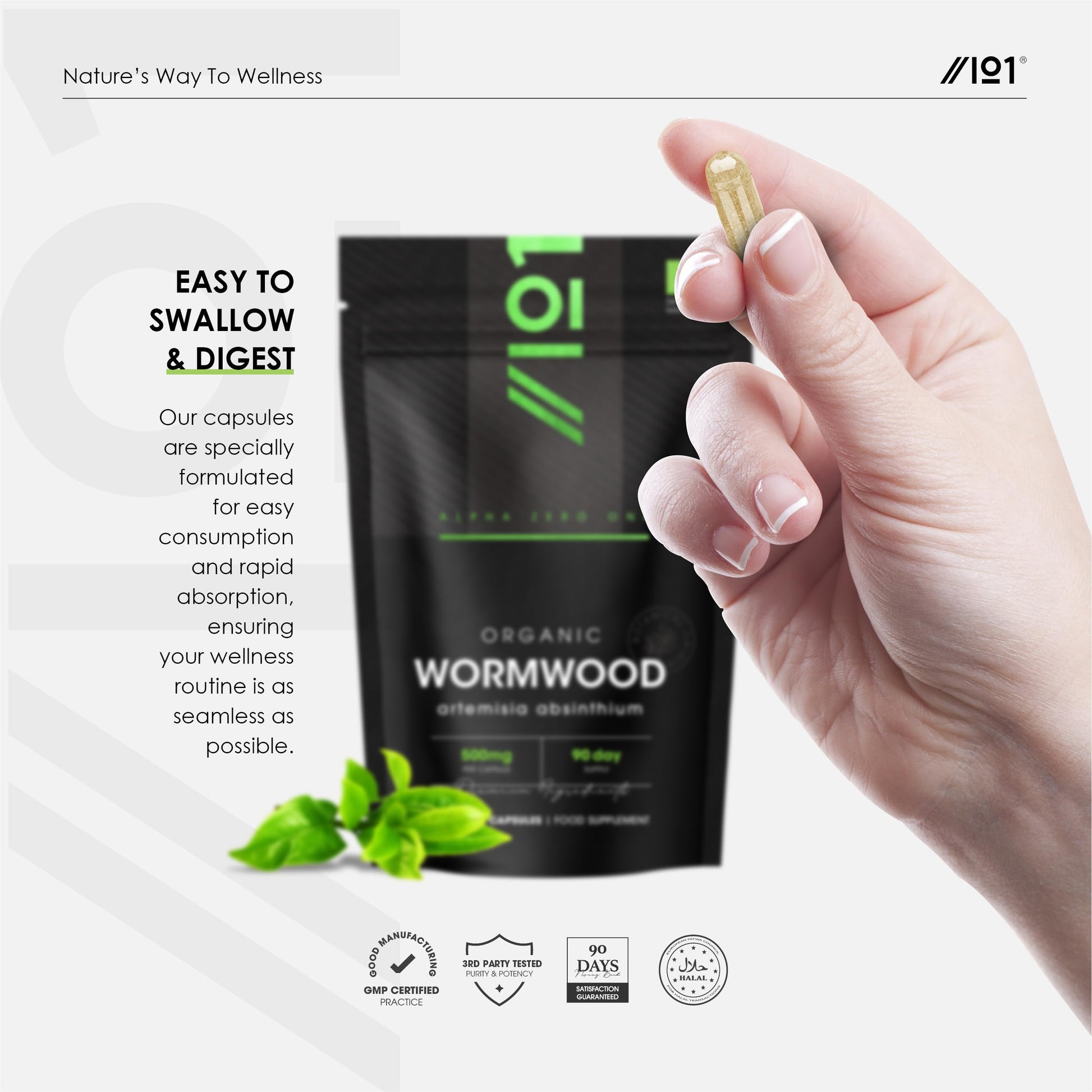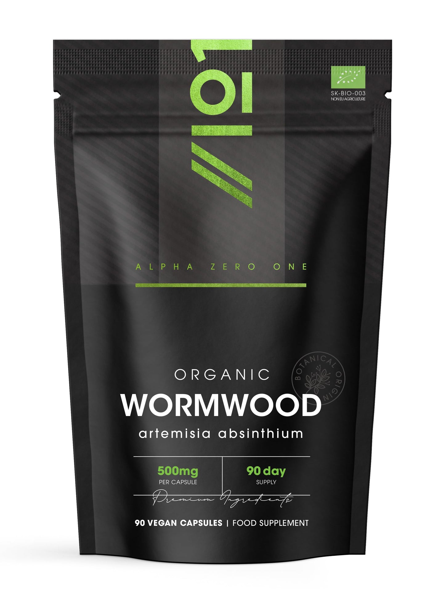 Organic Wormwood 500mg – High Strength Artemisia Absinthium Supplement – 90 Vegan Capsules (3 Months Supply) - Resealable and Recyclable Pouch – by Alpha01