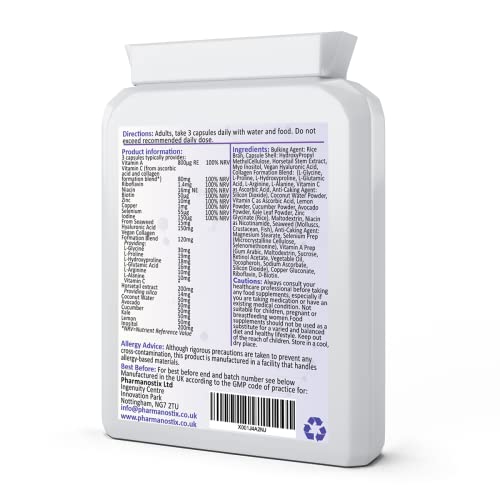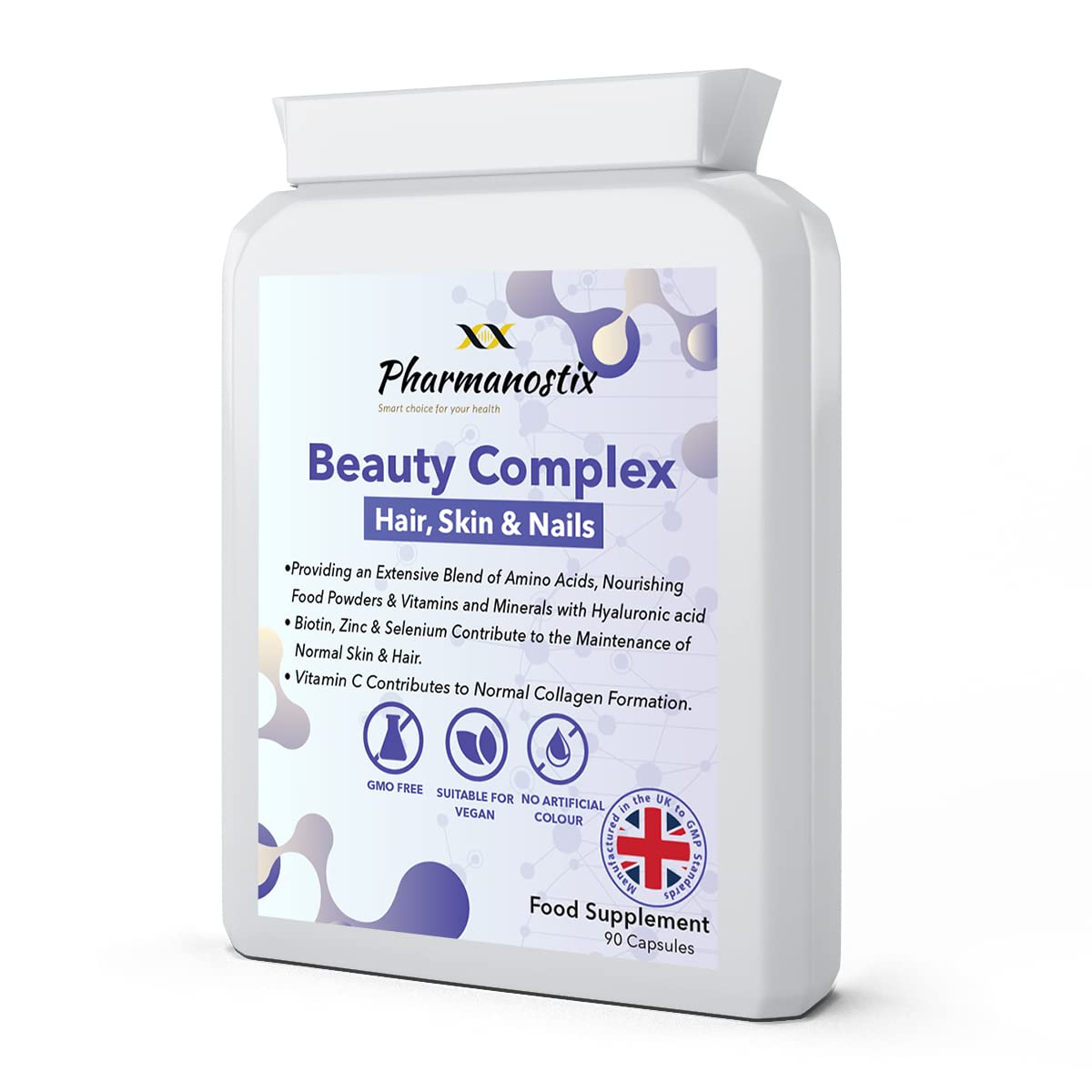 Beauty Complex for Hair, Skin & Nail is an advanced and nutrition packed formula providing an extensive blend of amino acids, nourishing food powders & vitamins and minerals with hyaluronic acid and Vitamin C. This supplement is specifically formulated to support the maintenance of healthy hair, skin and nails. - Vitamin C contributes to normal collagen formation for the normal function of skin. - Biotin, Selenium, Zinc, Iodine, Niacin, Riboflavin & Vitamin A contribute to the maintenance of normal skin. - Biotin, Zinc & Selenium contribute to the maintenance of normal hair. - Copper contributes to normal hair & skin pigmentation. Beauty Complex uses a bespoke blend of amino acids that are found in high quantities within Collagen and the associated connective tissues within the human body such as the blood vessels, the cartilage or the gums. These aminos are derived by fermentation and are 100% vegan suitable. The formula also includes specifically chosen foods and herbs, including Horsetail Extract, Coconut Water, Avocado, Cucumber and Kale. It also contains 200mg of Inositol per serving. SUITABLE FOR VEGETARIANS & VEGANS 90 Capsules Manufactured to the GMP standards and supplied in innovative and recyclable letterbox-friendly packaging. These procedures ensure that the basic manufacturing practices and prerequisites necessary for product quality and safety are being followed so that we can guarantee you receive consistently high quality products.More Info