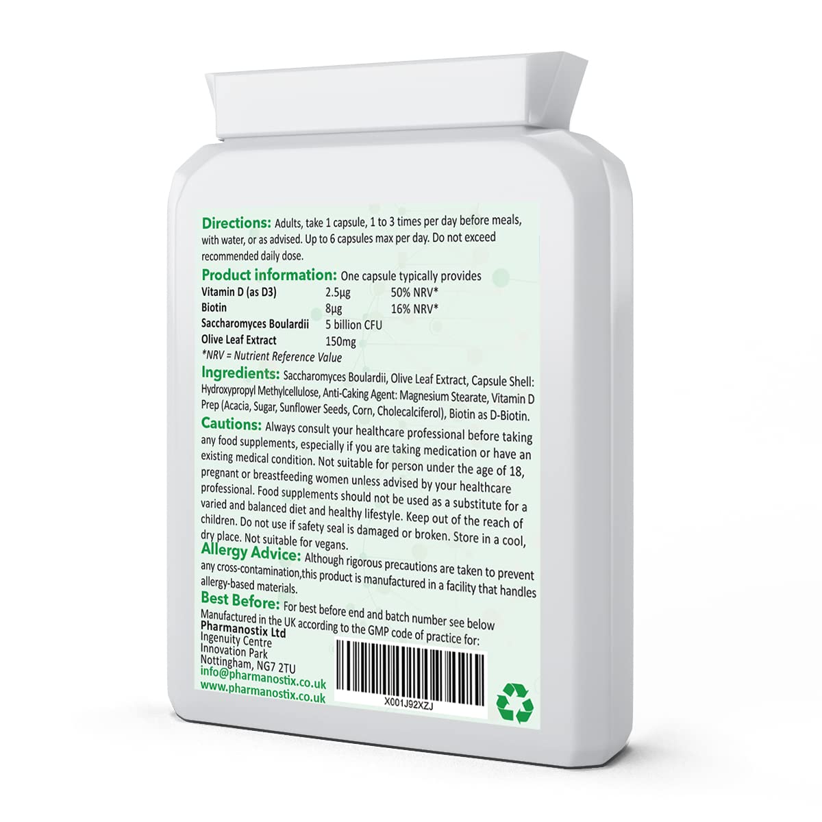 Saccharomyces Boulardii PLUS with Olive Leaf Extract, Vitamin D and Biotin - provides 5 billion cfu Saccharomyces Boulardii per capsule. Saccharomyces Boulardii is a beneficial bacteria yeast that is able to survive stomach acid. This yeast was first isolated from lychee and mangosteen fruit in the 1920s by a French scientist called Henri Boulard. He had observed natives of Southeast Asia chewing the skin of these fruits. Although it is in the same genus as Saccharomyces cerevisiae (baker’s, brewer’s or dietary yeast), Saccharomyces boulardii is not linked to the candida species. S. boulardii has been successfully researched and tested in many countries worldwide for over 50 years. Numerous clinical studies have shown the efficacy of S. boulardii. We use Biootic Saccharomyces Boulardii because: Proprietary Strain Identified with state-of-the-art genetic techniques Clinically studied Proven survival through the gastric system Extract of Olive Leaf may contribute to the protection of cells from oxidative stress, whilst Vitamin D contributes to the maintenance of normal bones, muscle function, teeth & immune system. Vitamin D also contributes to normal absorption/utilisation of calcium and phosphorus, to normal blood calcium levels and has a role in the process of cell division. Biotin contributes to: normal energy-yielding metabolism normal functioning of the nervous system normal macronutrient metabolism normal psychological function the maintenance of normal hair and skin the maintenance of normal mucous membranes Saccharomyces Boulardii UK Manufactured to GMP code of practice and supplied in innovative letterbox friendly and recyclable packaging.More Info