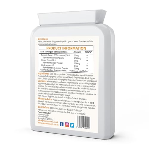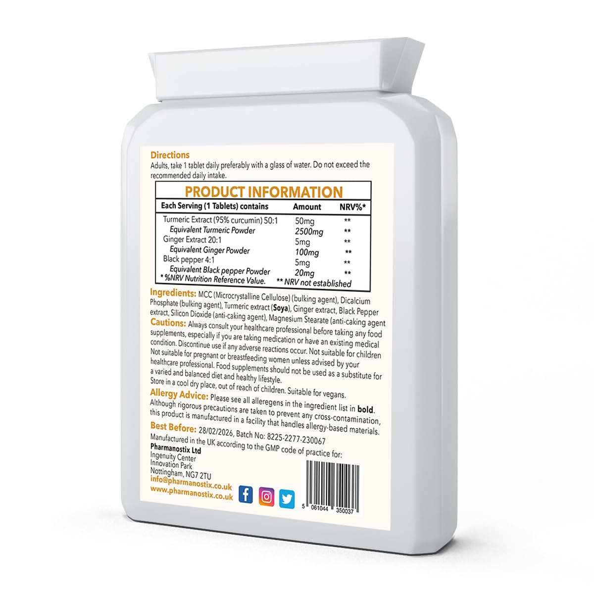 These high strength turmeric tablets provide 2500mg of turmeric per tablets (curcumin 95%) along with black pepper and ginger. Curcumin is the active ingredient in turmeric known for its anti-inflammatory and antioxidant properties. The addition of black pepper enhances the bioavailability of curcumin, aiding absorption. Each tablet serving also contains 100mg of ginger to support digestion. Produced in the UK, this vegan and gluten free supplement is conveniently encapsulated for easy consumption. Clinical trials have shown curcumin from turmeric to support joint, heart and brain health. Try incorporating these tablets into your daily wellness routine to experience the potential health benefits of turcumins powerful compounds.More Info
