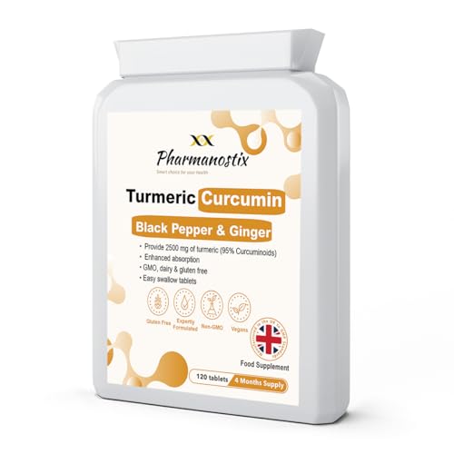 Pharmanostix Turmeric Supplements 2500mg with Black Pepper & Ginger, Curcumin 95%, 120 Tablets, Vegan & Gluten Free, UK Manufactured