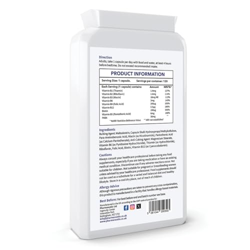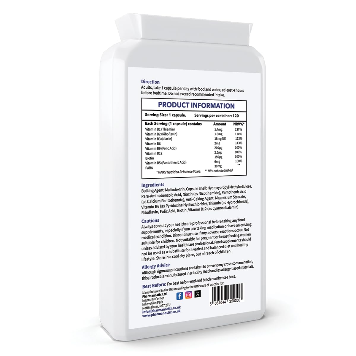 Pharmanostix Vitamin B Complex, 120 Vegan Capsules, Minimum 100 NRV Daily Supplement, Includes Essential Multi B-Vitamins B1, B2, B3, B5, B6, B12, Biotin, Folic Acid & PABA