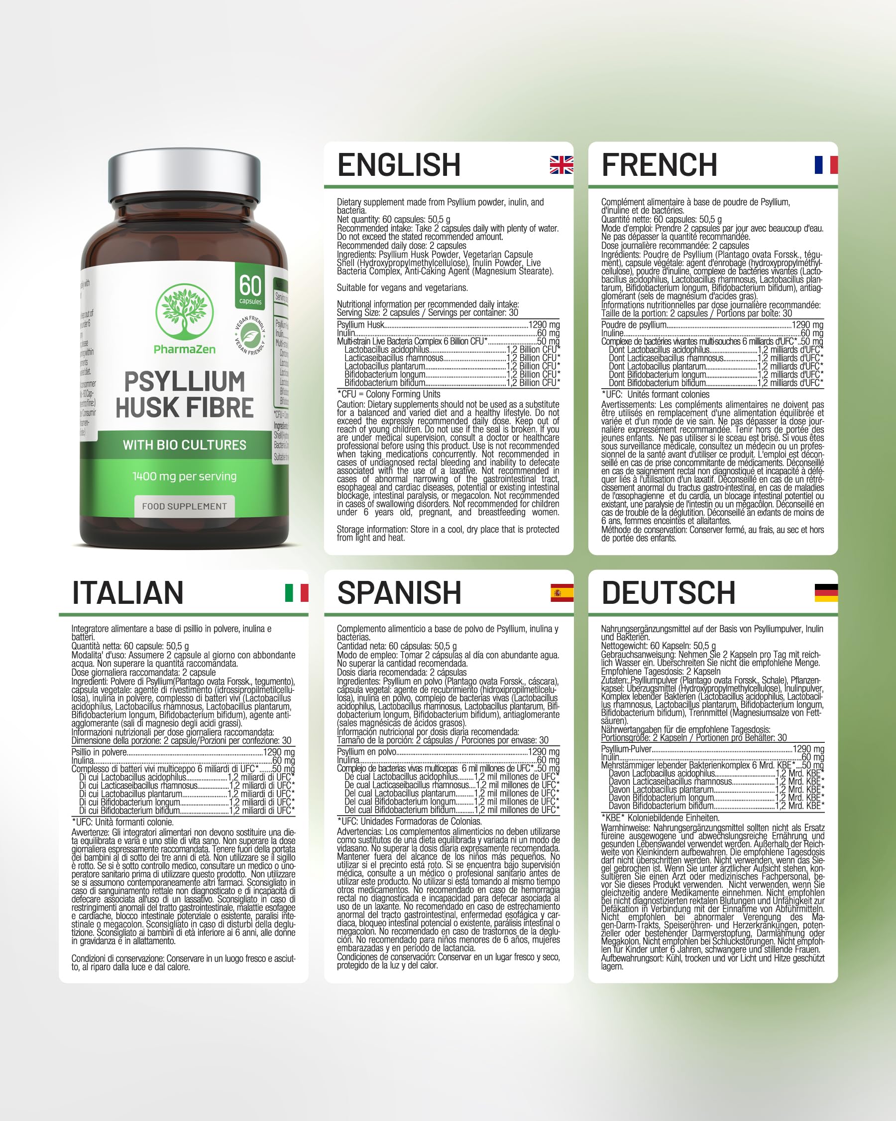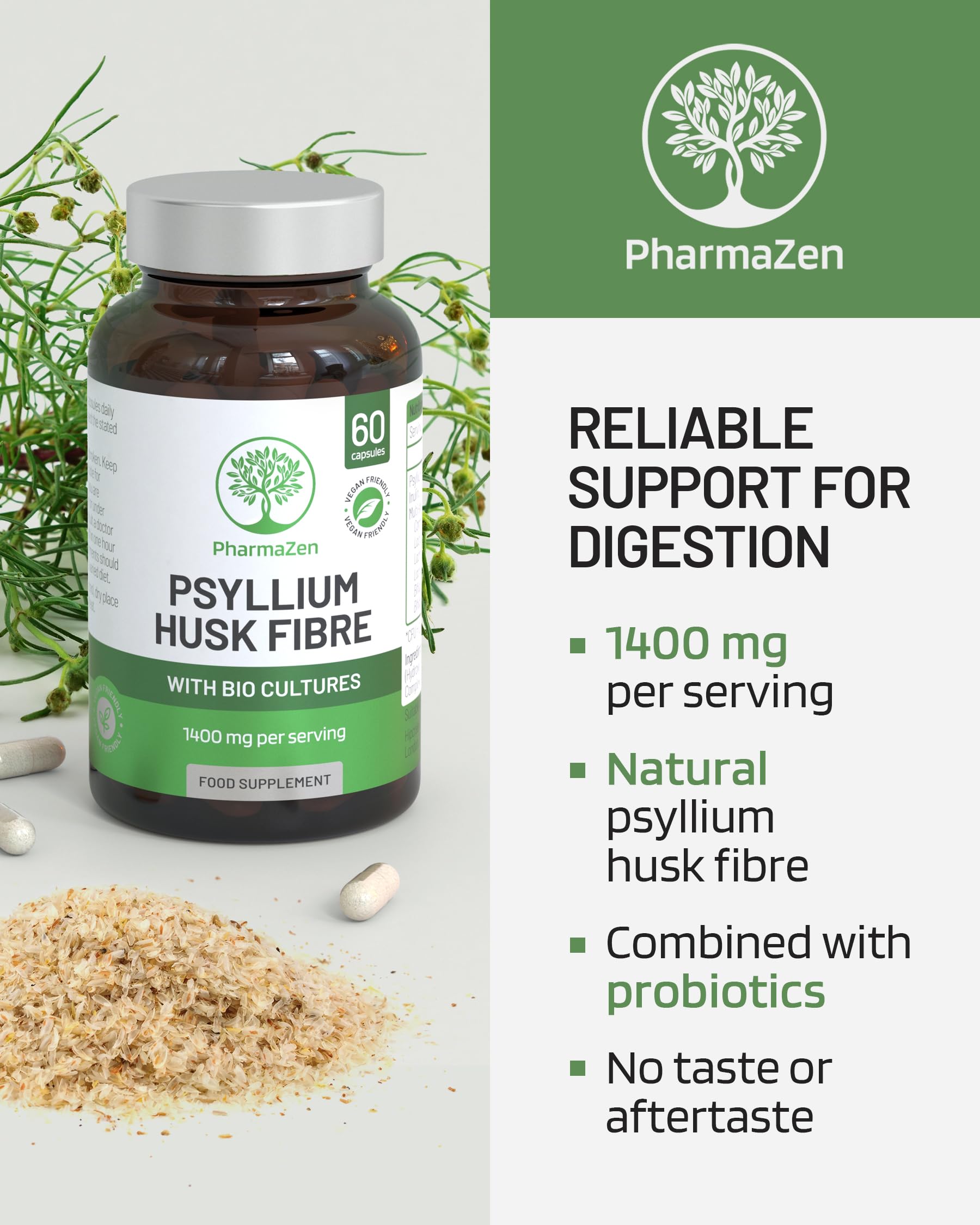 PharmaZen Psyllium Husk Capsules with Probiotics - Fibre Supplement Complex 1400mg - 60 Capsules - 6 Billion Probiotics 5 Strains