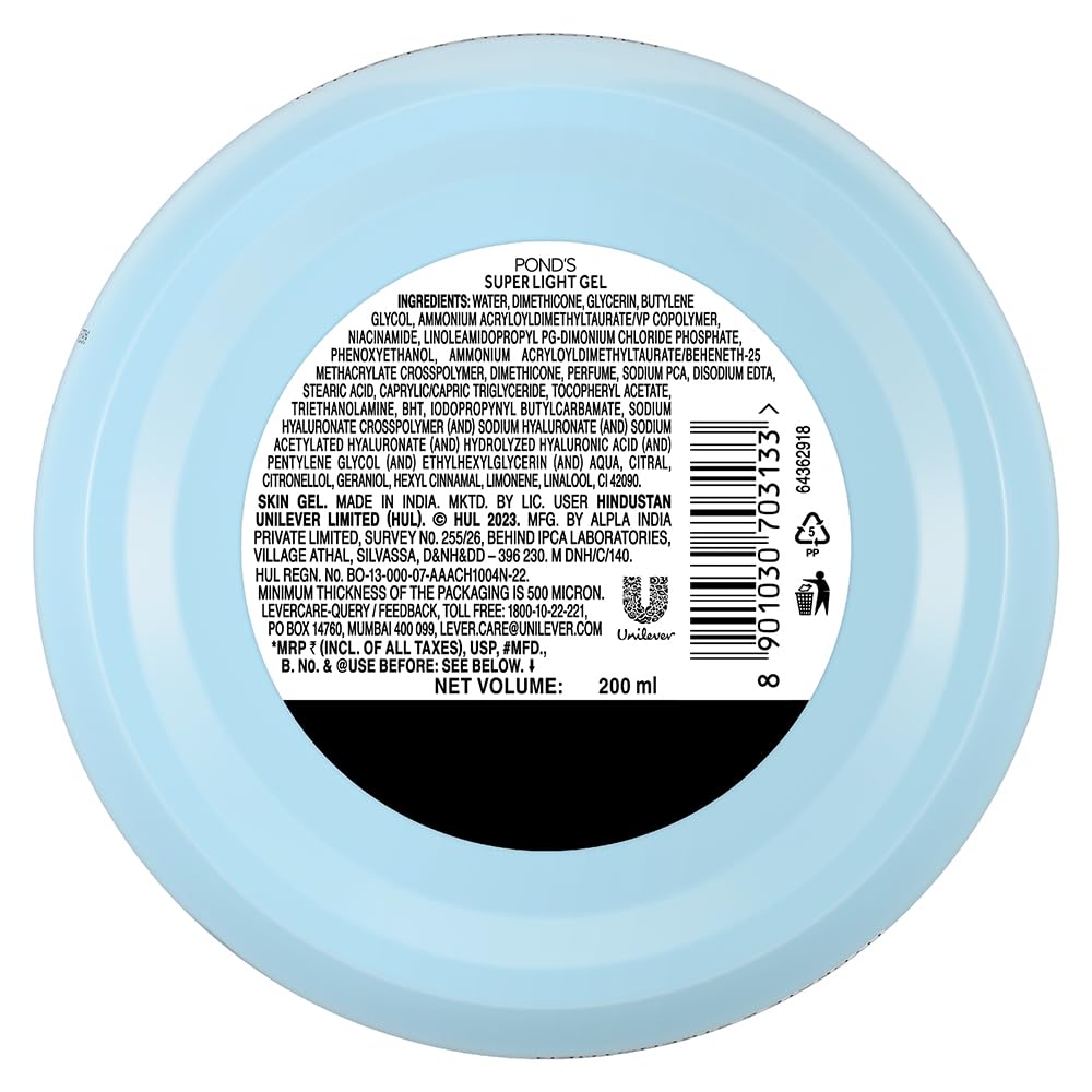 Looking for 24 hours of moisturization for your skin? Look no further! Introducing the all new Pond’s Super Light Gel - your go-to moisturizer for all seasons. Infused with the goodness of Hyaluronic Acid|| Vitamin E and Glycerine|| this super light moisturizer absorbs faster than regular creams and gives 24-hour hydration for a water-fresh glow! It helps restore the moisture balance to keep your skin soft and smooth. Its lightweight formula absorbs into the skin instantly without leaving any sticky feeling|| making it ideal for all seasons|| even in scorching summers. Infused with moisture-boosting Hyaluronic Acid this moisturiser improves your skin’s natural moisture holding capacity|| making it soft|| smooth and bouncy from within. Its non-oily formula keeps oiliness and stickiness at bay|| keeping your skin feeling fresh and glowing from AM to PM. The 24-hour moisture lock technology locks in moisture deep within your skin all day longMore Info