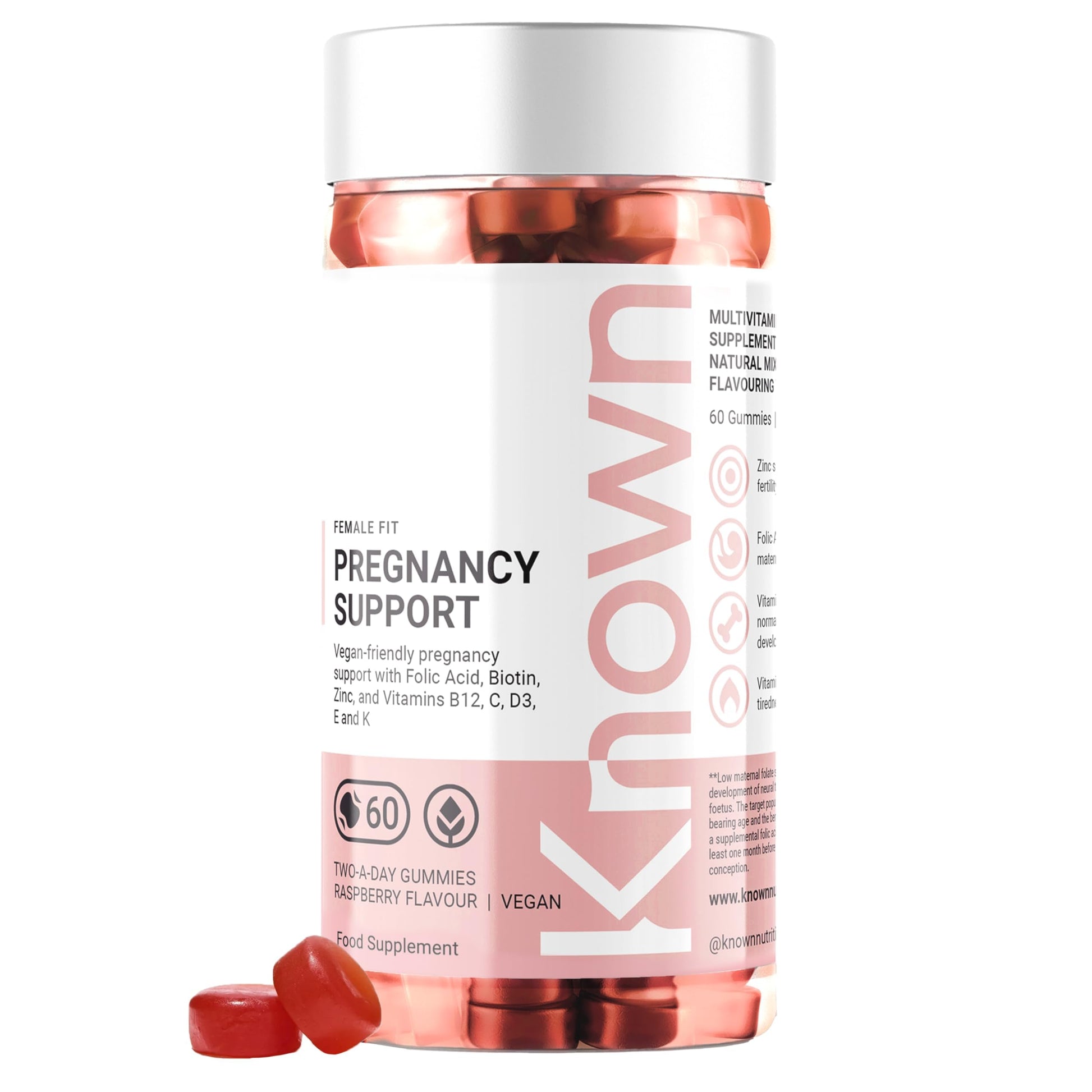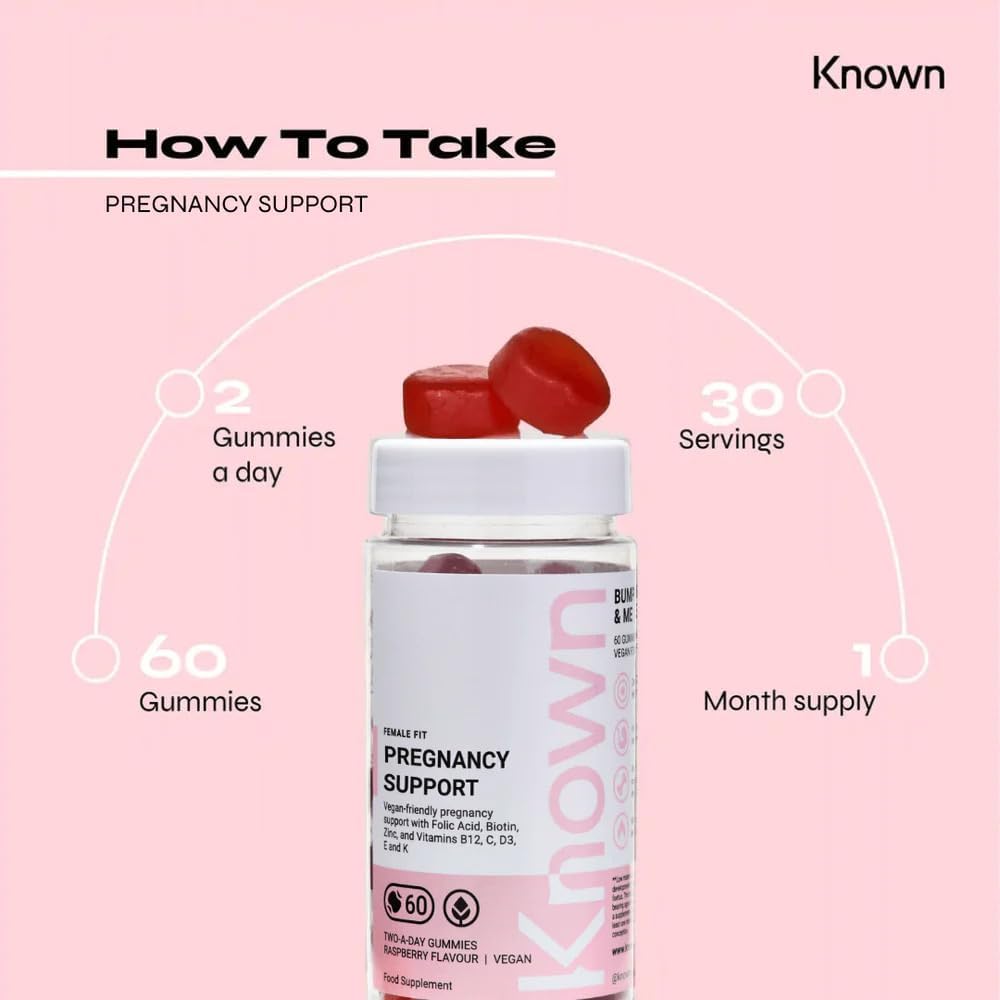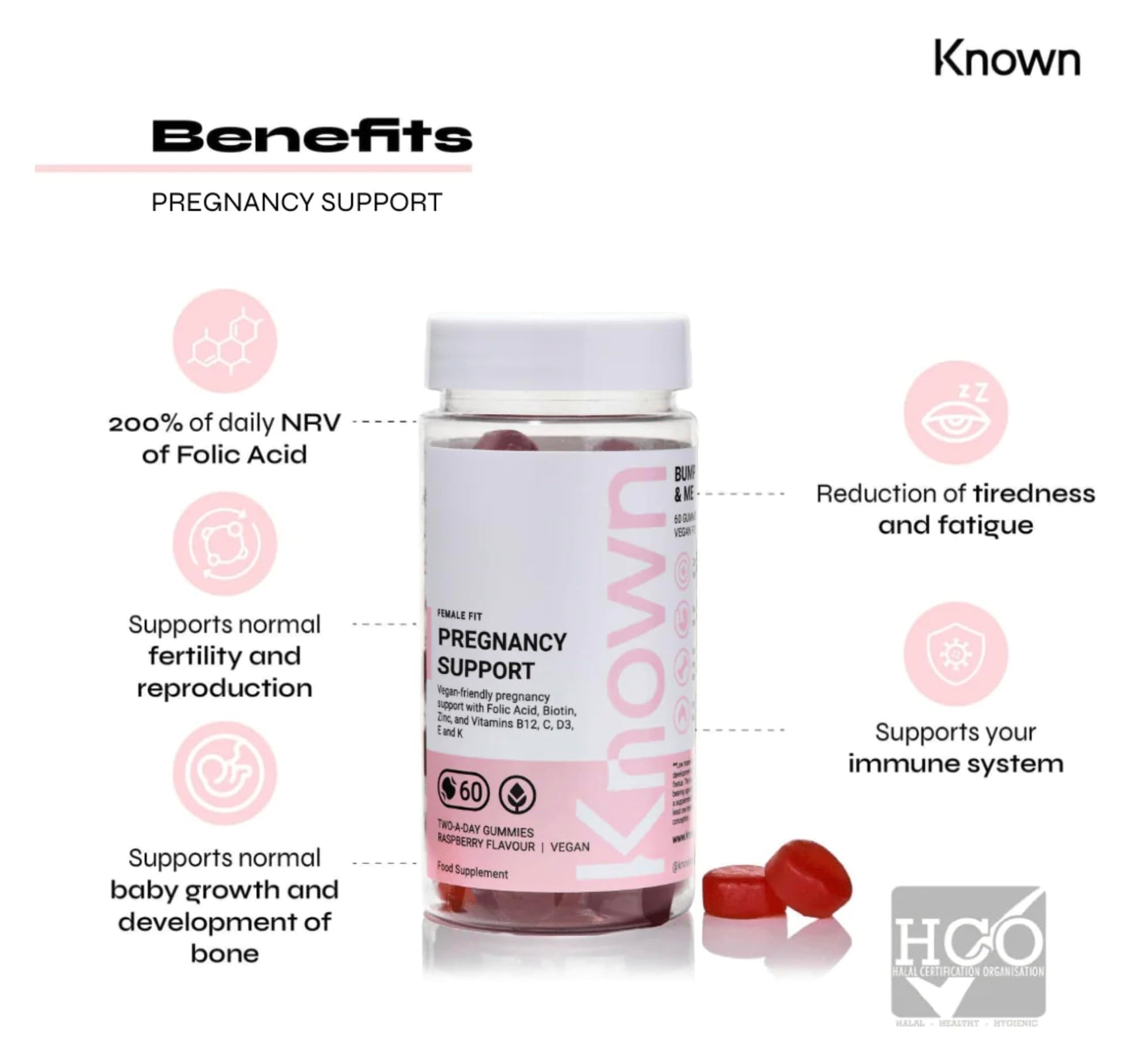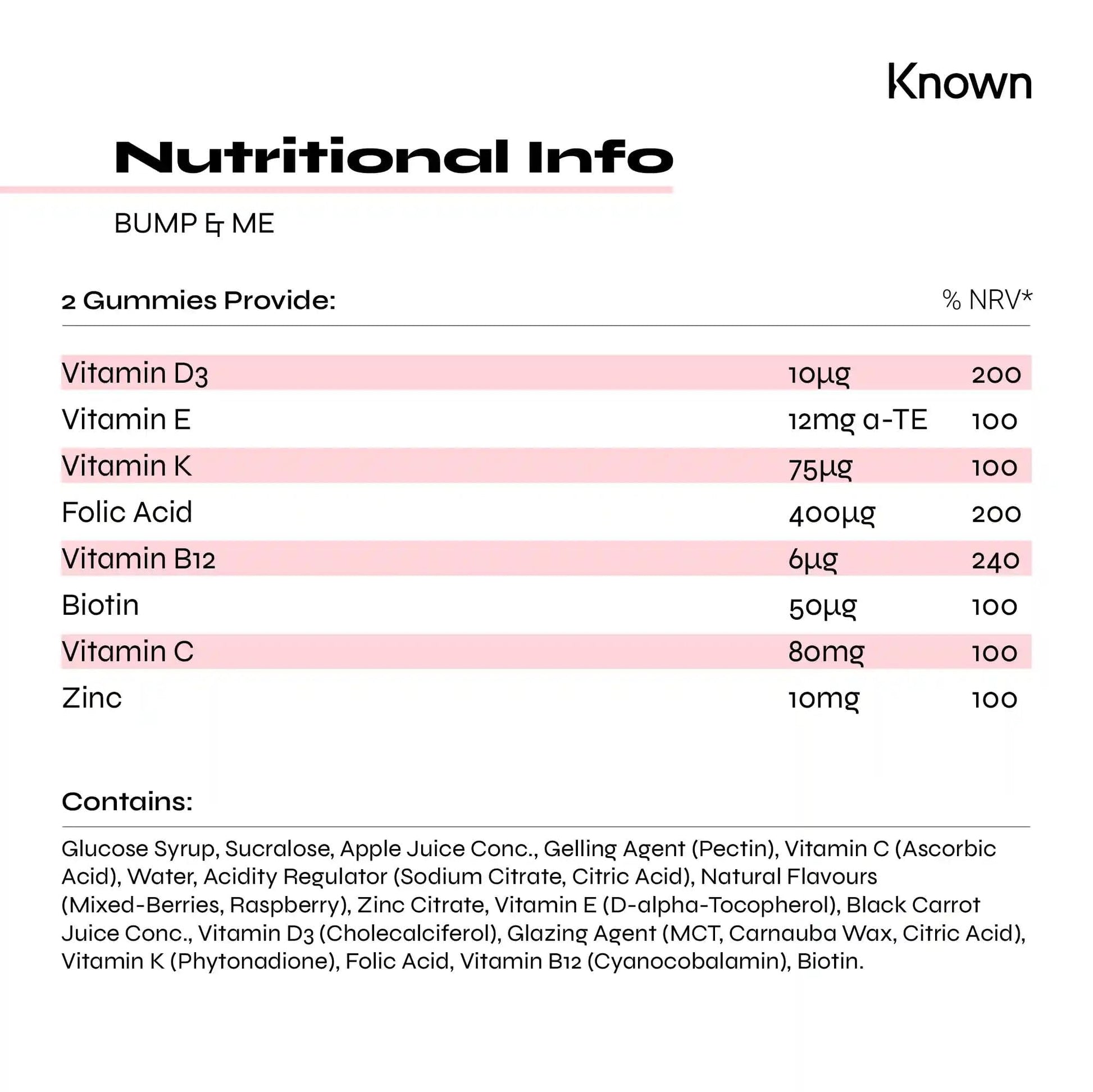 Expertly formulated to support you whilst you’re trying for a baby right through to your prenatal and postnatal term. Containing a unique blend of 8 essential pregnancy vitamins and minerals, each ingredient has been handpicked for its proven ability to support the increase of maternal folate status and help normal immune function. All whilst helping to tiredness and lethargy throughout pregnancy and your prenatal stage of pregnancy. Each tub contains 60 gummies. Suitable for vegans. Each ingredient has been scientifically proven to help: - Baby’s Growth - Fights Tiredness - Immune System -S upport Fertility -Healthy Bones - Absorbs Iron. If you’re trying for a little one, the UK department of health recommends taking 400mcg of folic acid from conception right up to 12 weeks of pregnancy. We’ve harnessed that exact amount and packed it into our Bump and Me Vitamin Gummies for women, meaning you get everything you need to look after both you and bump in those crucial stages of early life in the postnatal term. Gorgeously sweet tasting and packed with everything you need to support both you and baby, these pregnancy vitamin gummies are the perfect supplement to support you throughout your journey to becoming a mum. How to use: Take two a day. Ingredients: Glucose Syrup, Sucrose, Concentrated Apple Juice, Water, Gelling Agent (Pectin), Vitamin C, Acidity Regulators (Citric Acid, Sodium Citrate, Lactic Acid), Zinc Citrate, Natural Flavourings, Vitamin E, Colour (Anthocyanins), Vitamin B12, Vegetable Oils (Canola, Coconut), Vitamin K1, Folic Acid, Glazing Agent (Carnauba Wax), Vitamin D3, Biotin. Doesn’t Contain: Soy Dairy Gluten Artificial colours and flavours PreservativesMore Info