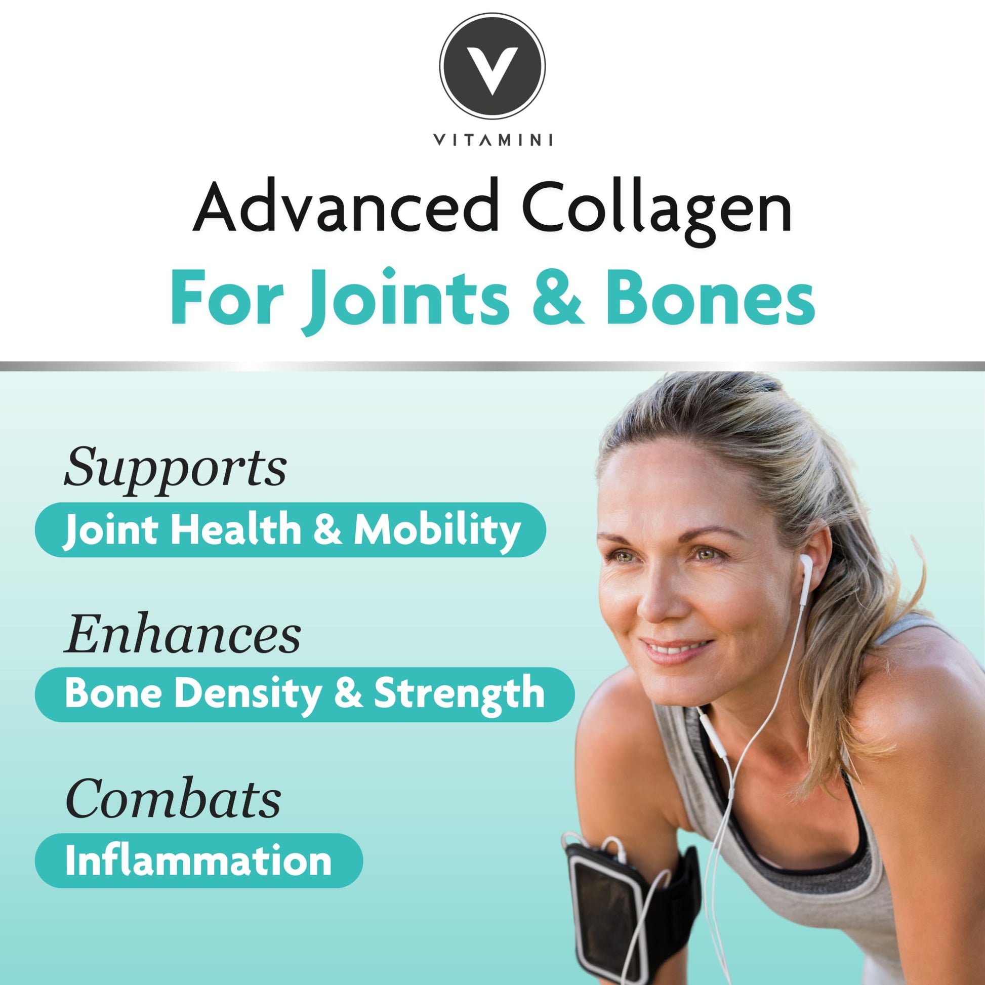 Experience the benefits of VITAMINI collagen joint care supplements for women, expertly formulated to support healthy joints and bones. Our high-strength marine collagen is designed to combat age-related issues and provide optimal support for your joints and bones. Enriched with essential nutrients like Vitamin C, Vitamin D3 Tablets, zinc, and copper, our formula is backed by scientific research and made in the UK. Also contains Magnesium Zinc and Bone Health Supplements for a comprehensive approach to joint and bone health.More Info