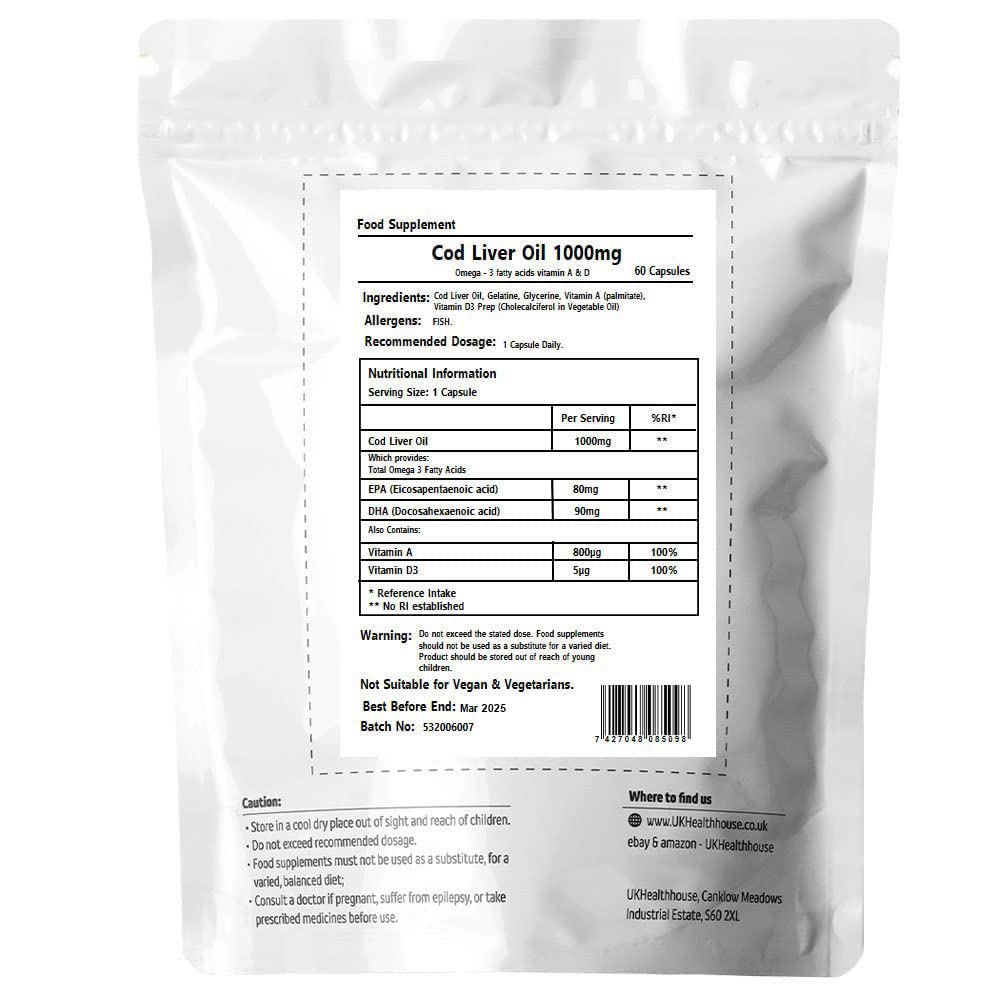 Premium - Cod Liver Oil Capsules - 1000mg x 60 - High Strength - Omega-3 Fatty Acids Vitamin A & D - EPA and DHA