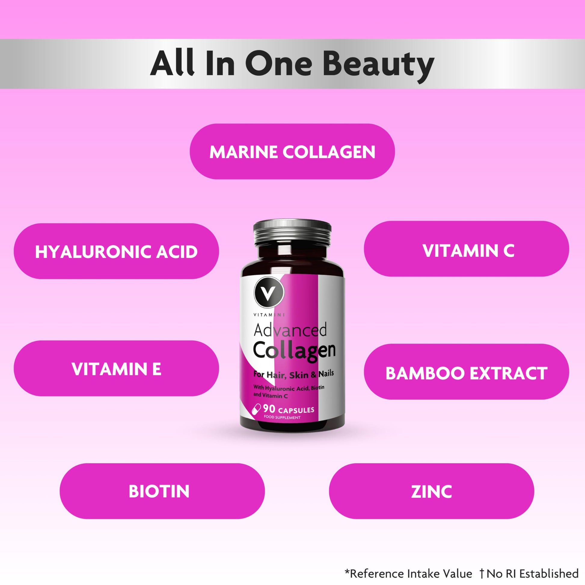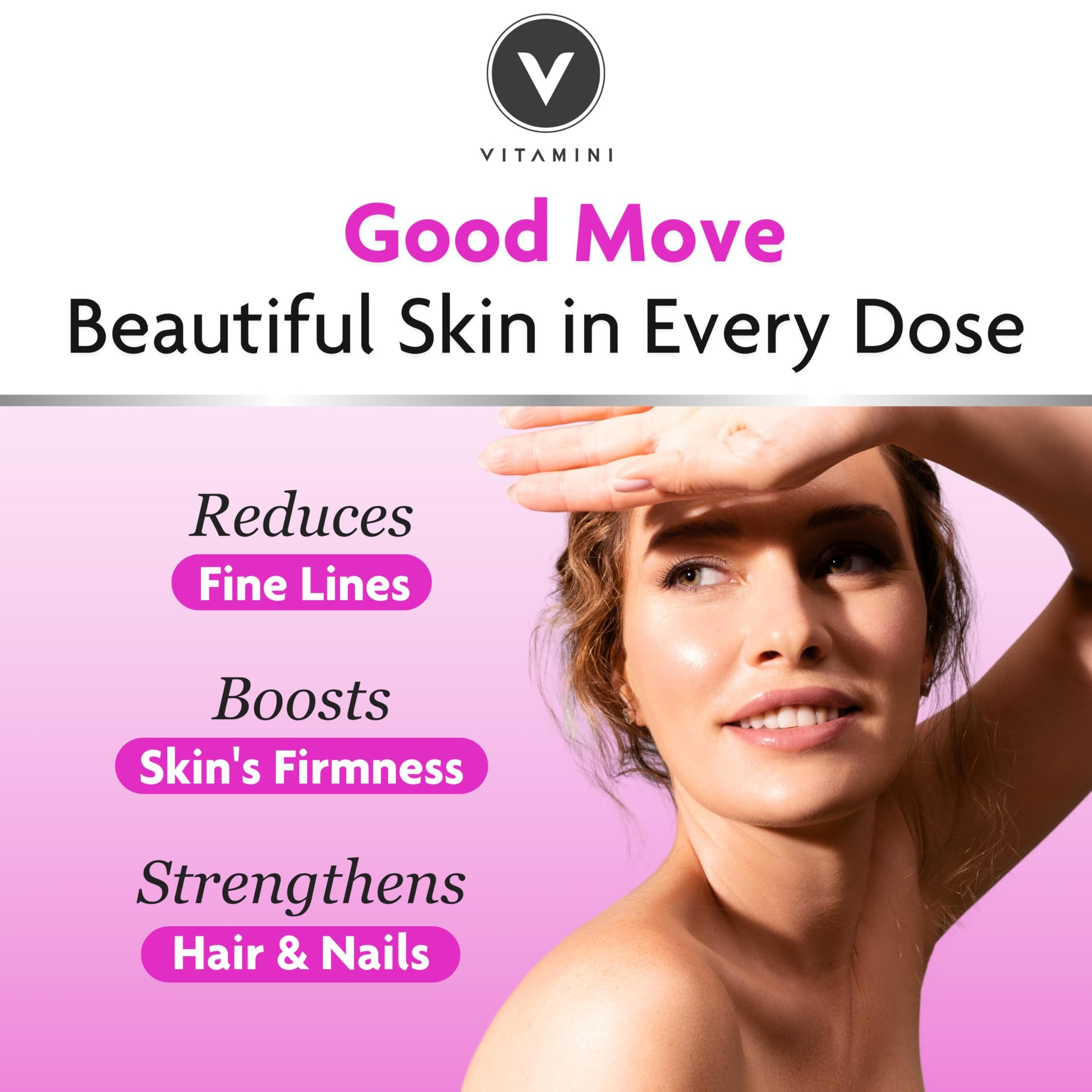 High-strength hair, skin, and nails vitamins for women. Collagen is the most abundant protein in the human body. It's naturally occurring and provides strength and structure. After the age of 20, collagen production starts to decline (by around 1% each year), making supplementation important to help counteract this loss. Taking hydrolyzed collagen supplements can replenish some of your body's depleted collagen supply. Not only do our premium quality advanced collagen tablets for women provide a high-strength dose of premium Type 1 marine collagen, but they also contain Vitamin C to help stimulate the body’s own natural collagen production making it the perfect collagen for skin tightening. These high strength Collagen and Hyaluronic Acid supplements are made from Collagen Peptides easily absorbable by the body. It contains essential vitamins and minerals to help maintain healthy skin, hair, nails which makes it an essential collagen for women. Take your wellness to the next level with VITAMINI pure marine collagen capsules.More Info