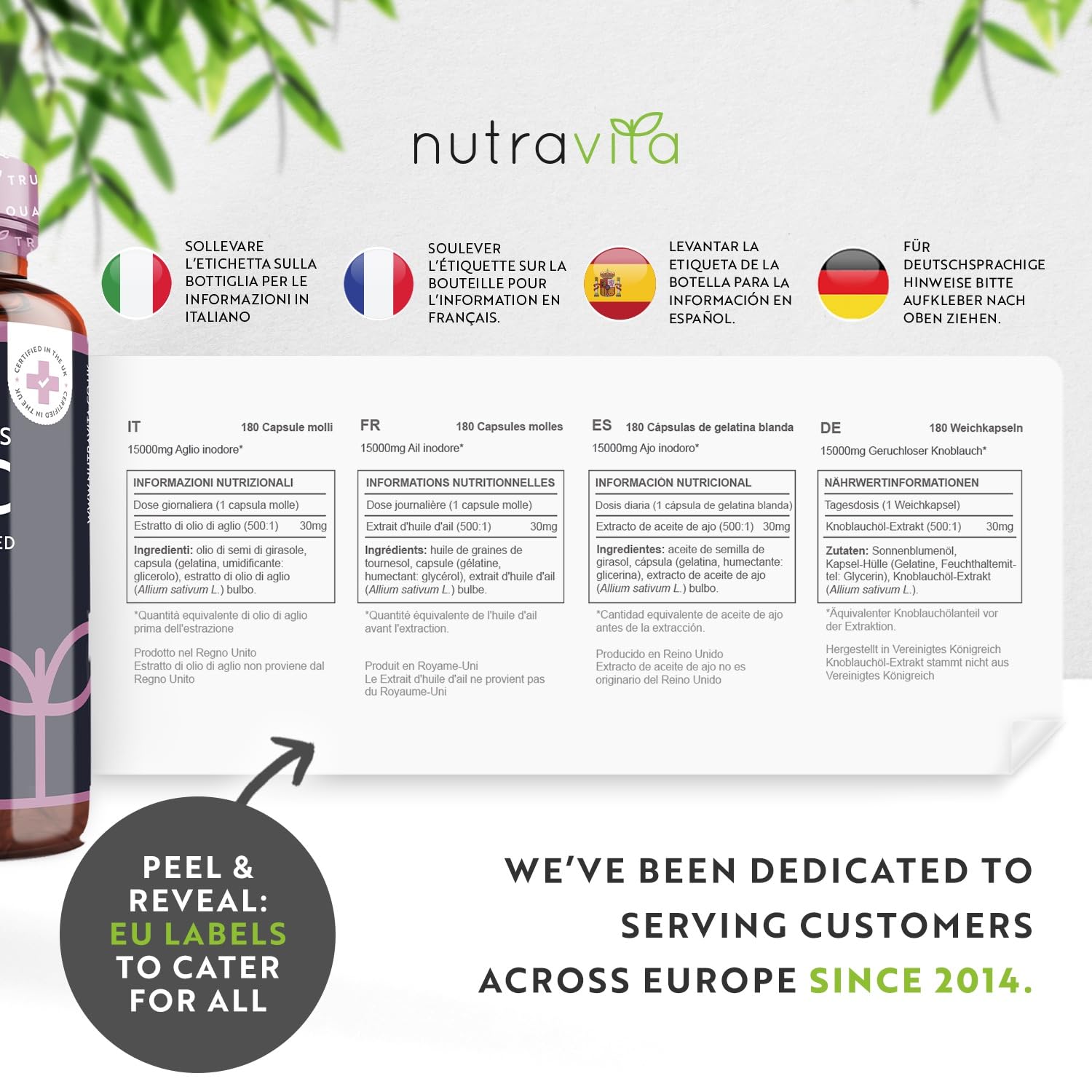 - ✔ ALL THE HEALTH BENEFITS WITHOUT THE UNPLEASANT SMELL – Garlic, being one of the leading superfoods has been known for its variety of dietary and health benefits. Our careful extraction process allows to retain the potent natural compound called Allicin without the strong odour and aftertaste. Each of our Garlic capsule contains 12-18% of this active ingredient, meaning it has the equivalent of 3,600mcg to 5,400mcg of Allicin per capsule.