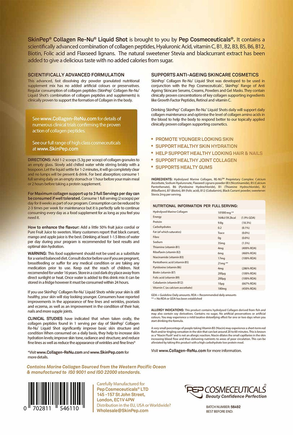 Collagen Re-Nu Liquid Shot was developed to be used in conjunction with our Serums, Creams, Powders and Gel Masks. Drinking Collagen Re-Nu Liquid Shots daily will boost daily collagen production to allow you to respond better to SkinPep topically applied clinically proven collagen supporting cosmetics.