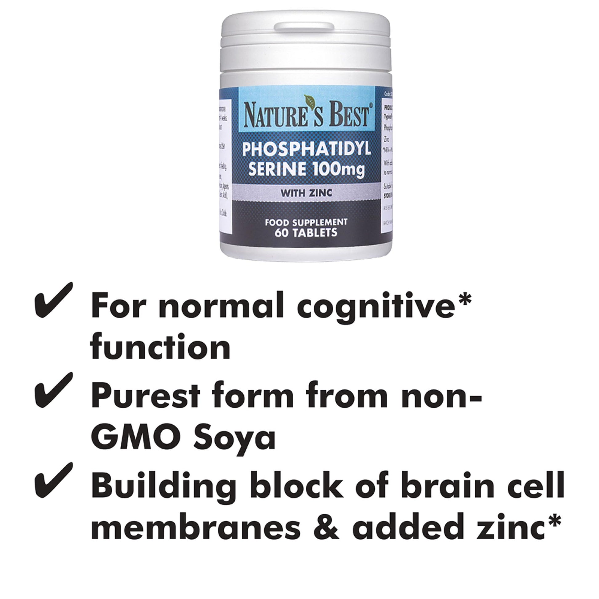 Premium Phosphatidyl Serine 100mg - Supports Cognitive Function* - 60 Tablets, 1-3 Daily - Clinically Studied Level - Enriched with 5mg Zinc - Non-GMO SOYA - 1+ Month's Supply, UK Made
