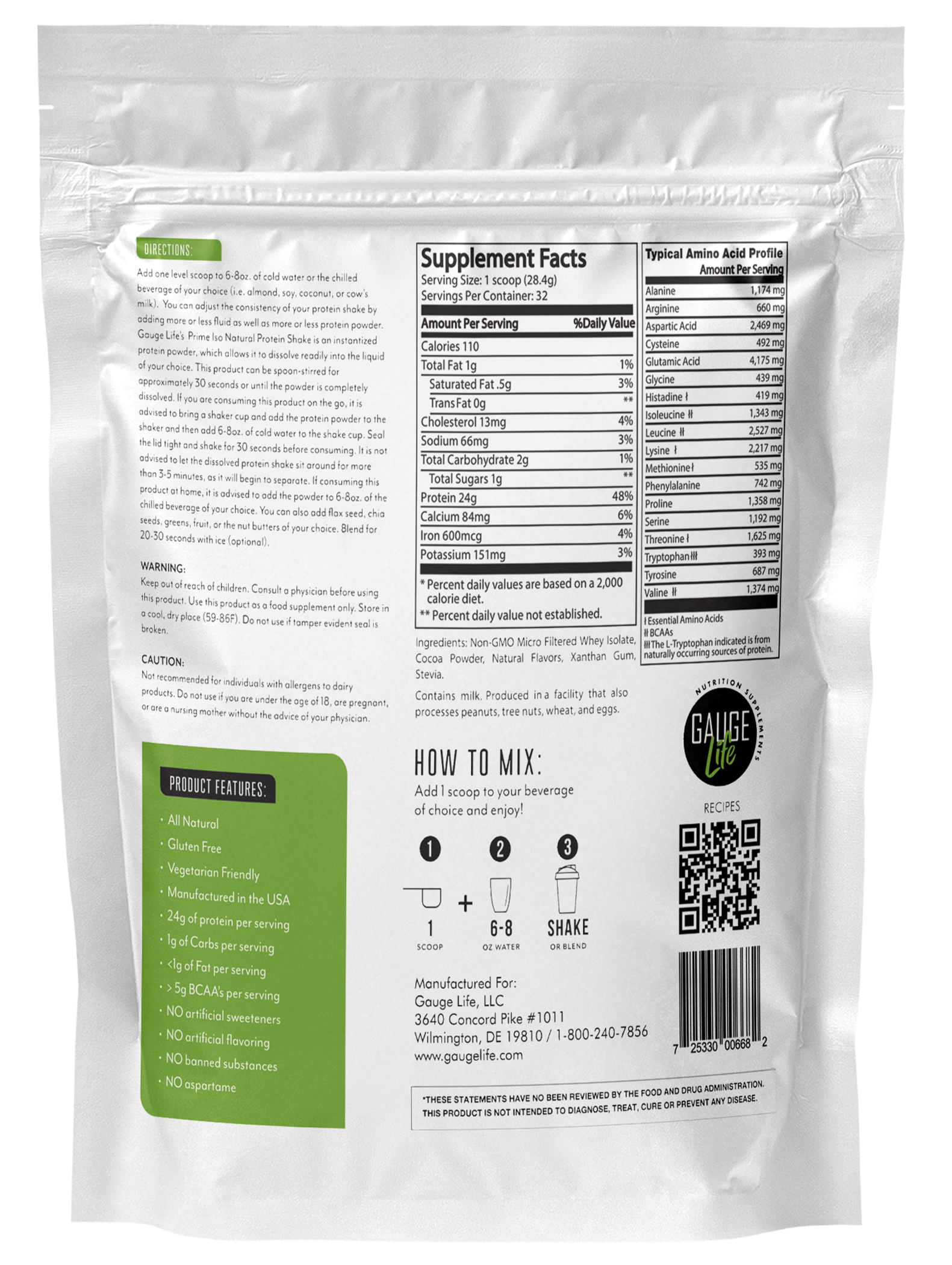 Gauge Life's Prime All-Natural Whey Protein Isolate is a high-quality protein powder developed without a single artificial ingredient. Each serving provides 25g of micro-filtered pure whey protein isolate with over 5 grams of branched chain amino acids. Prime All-Natural Whey Protein Isolate is free of artificial sweeteners, artificial flavors, contains zero gluten, zero banned substances, and only 110 calories per serving. Excellent for building, toning, or shredding yet versatile for use as a post workout, blended with your favorite ingredients as a smoothie, or as a nighttime protein before bed. Vegetarian Friendly. Manufactured in the USA. These statements have not been evaluated by the Food and Drug Administration. This product is not intended to diagnose, treat, cure or prevent any disease.