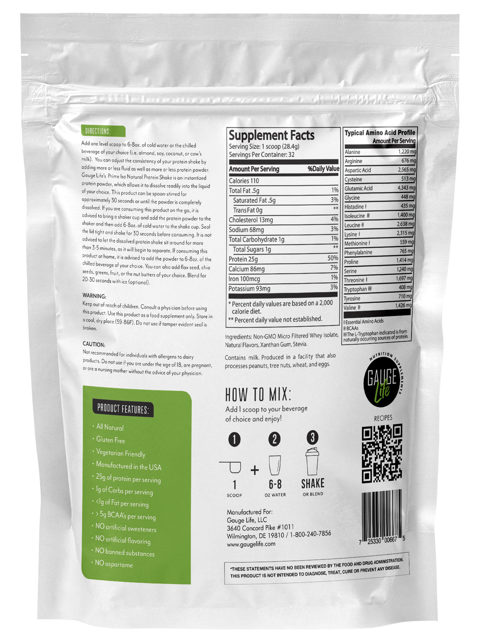 Gauge Life's Prime All-Natural Whey Protein Isolate is a high-quality protein powder developed without a single artificial ingredient. Each serving provides 25g of micro-filtered pure whey protein isolate with over 5 grams of branched chain amino acids. Prime All-Natural Whey Protein Isolate is free of artificial sweeteners, artificial flavors, contains zero gluten, zero banned substances, and only 110 calories per serving. Excellent for building, toning, or shredding yet versatile for use as a post workout, blended with your favorite ingredients as a smoothie, or as a nighttime protein before bed. Vegetarian Friendly. Manufactured in the USA. These statements have not been evaluated by the Food and Drug Administration. This product is not intended to diagnose, treat, cure or prevent any disease.