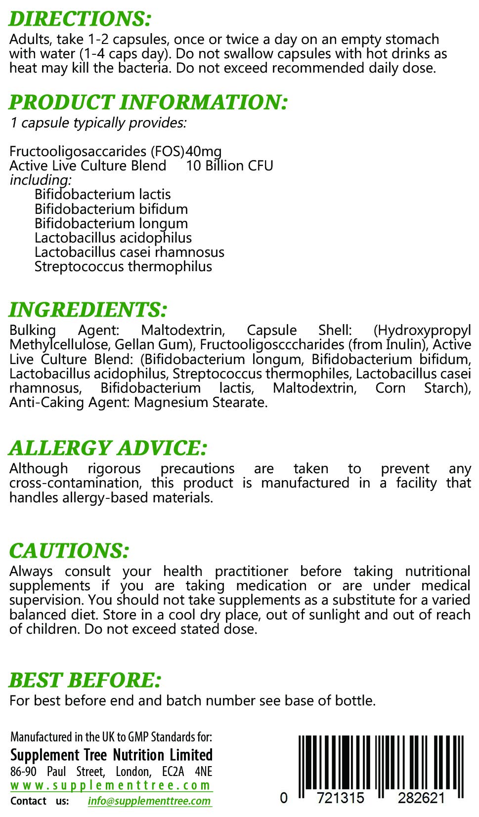 Probiotic Complex 10 Billion CFU provides an effective natural blend of acidophilus based probiotics to support your digestive function. Using Supplement Tree Probiotic Complex 10 Billion CFU capsules as a daily supplement may help maintain healthy levels of friendly bacteria, which play a vital role in supporting many of our body's core functions.