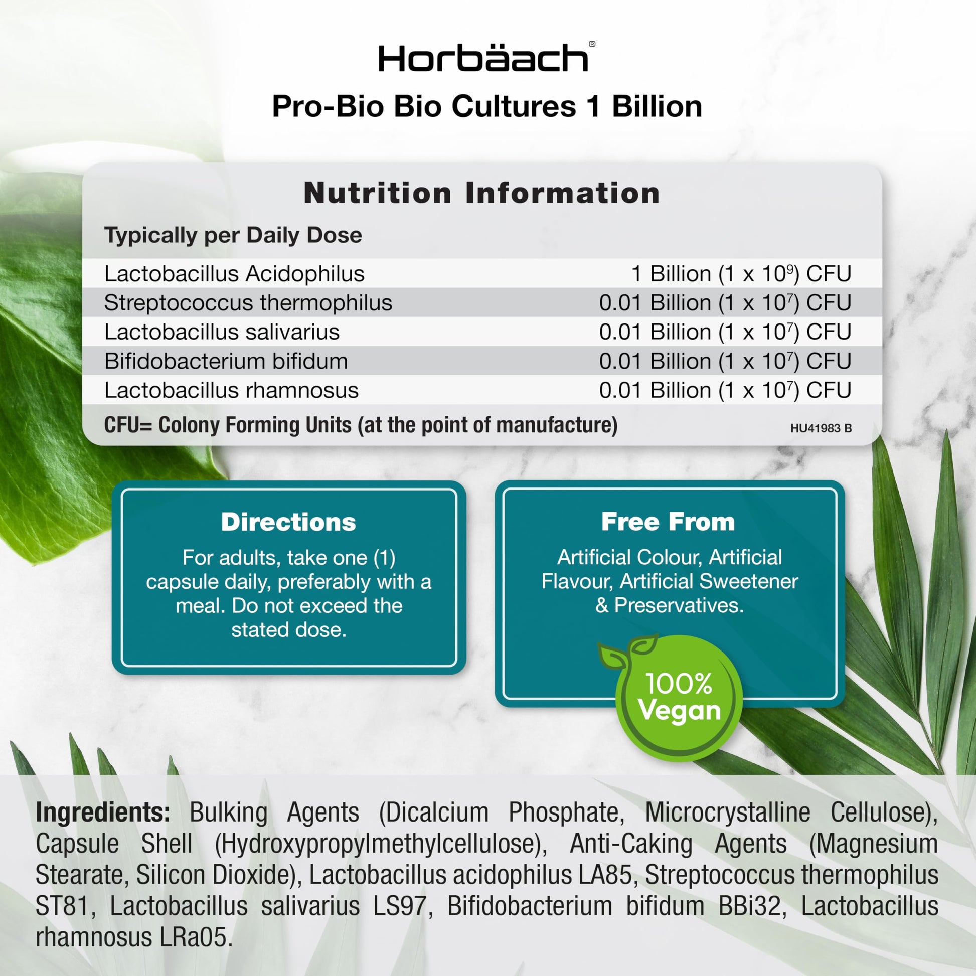 Bio Cultures are live bacteria and yeasts that are good for you, especially your digestive system. We usually think of these as germs, but your body is actually full of bacteria, both good and bad, you'll be glad to know that Probiotics are often called 'good' or 'friendly' bacteria because they help keep your gut healthy! They are believed to support the enzyme's work as well as support your liver health. You can find bio-cultures in supplements and some foods like yogurt, kefir, sauerkraut, tempeh, kimchi, miso, kombucha drinks, and more. If you can't or prefer not to eat any of these foods, a supplement is a surefire way to feel the powerful effects of bio-cultures on your health! These are available in many forms including chewable tablets, pills, gummies, powder, sachets, etc, for adults and children (kids); and to support different parts of your body such vaginal probiotics, colon cleanse, to help with antibiotics treatments, prebiotics, and often mixed with multivitamin complexes. Horbaach oral Pro-Bio tablets contain 1 billion probiotic bacteria per daily dose and are blended with 5 live strains of bacteria. There's no better formula out there! Simply take one (1) tablet a day (morning or night), preferably with a meal, and reap the benefits of this amazing probiotic supplement.More Info