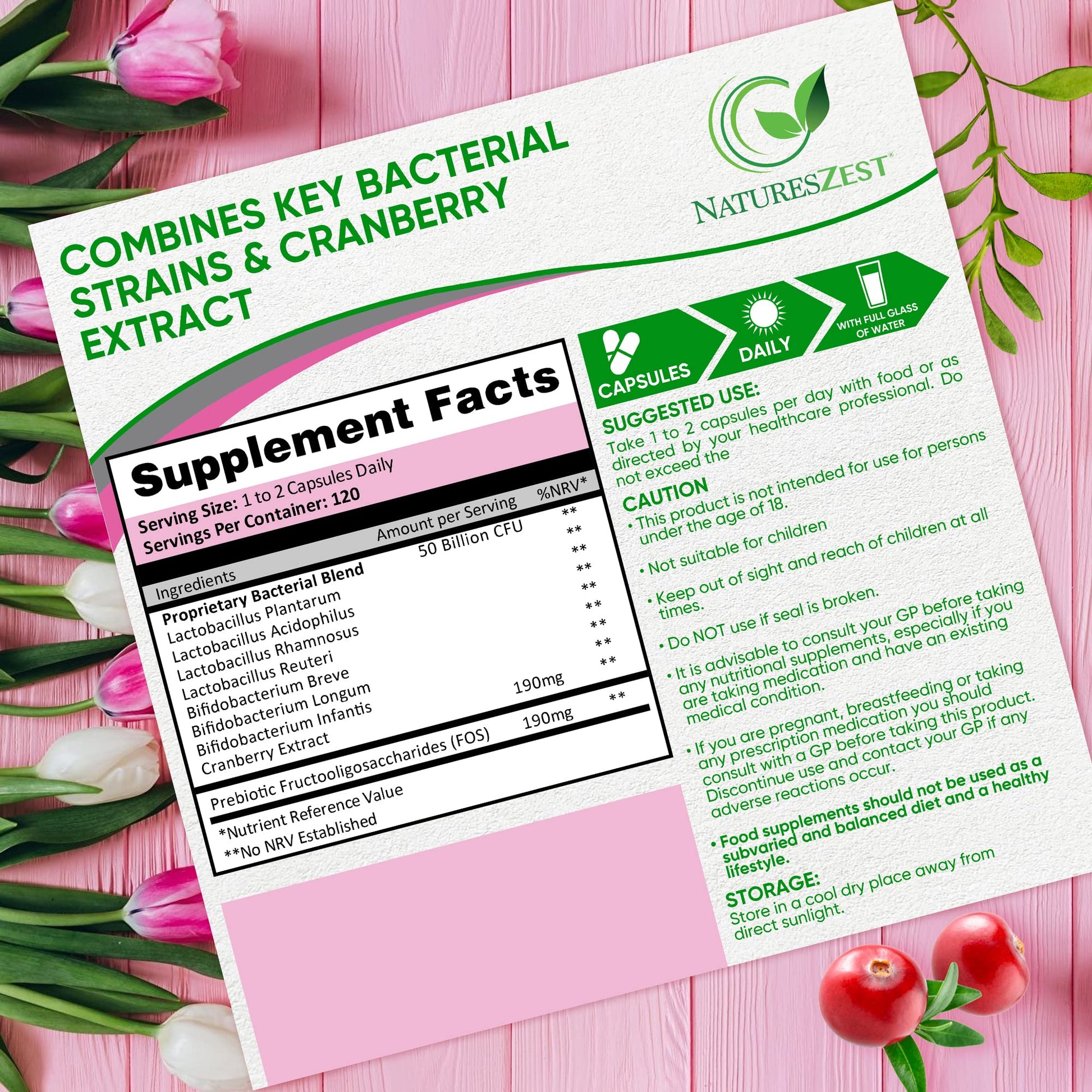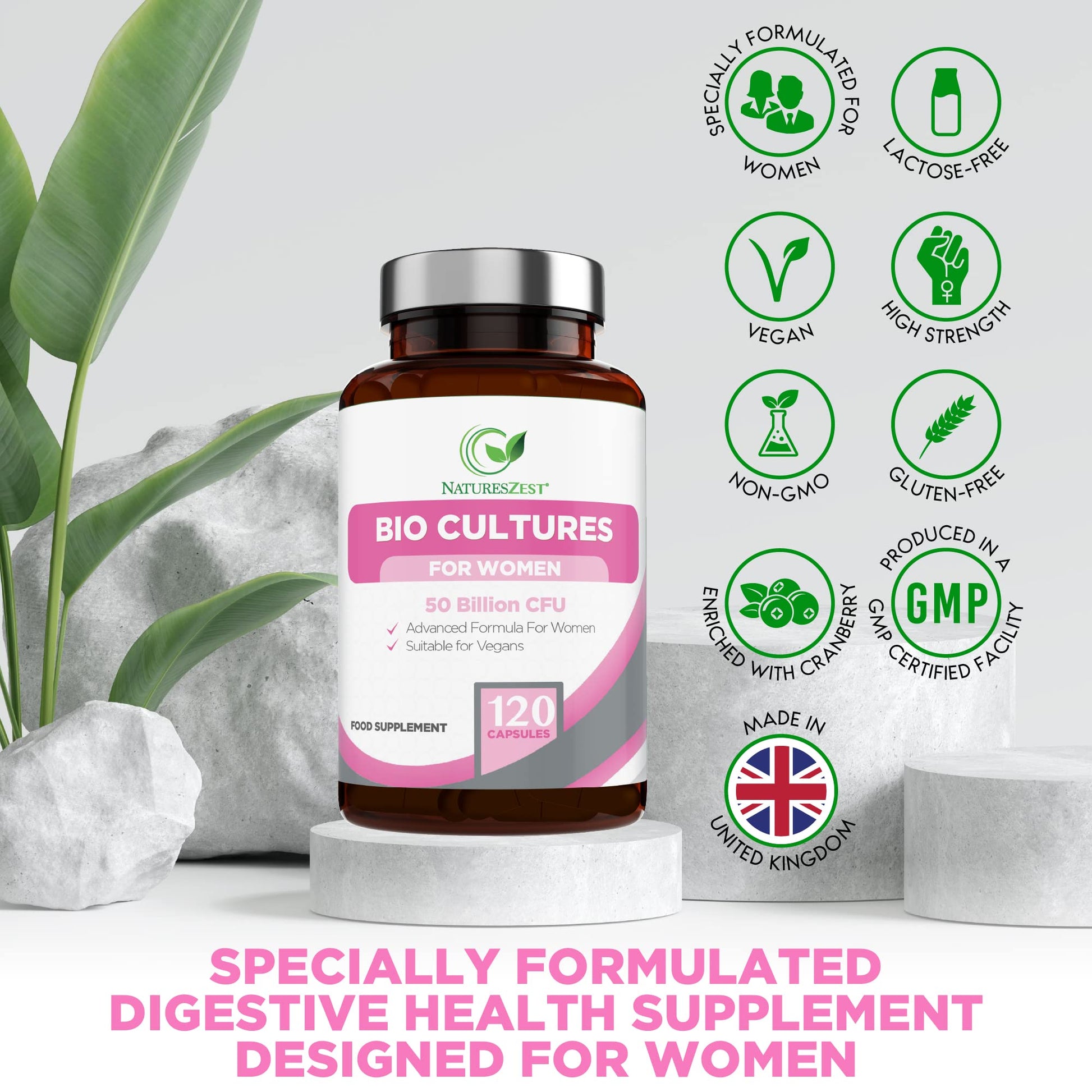 Natures Zest Women’s Bio Cultures contains extensively researched strains of natural bacteria such as Lactobacillus rhamnosus and Lactobacillus reuteri which have shown to help support female digestive and intimate health.