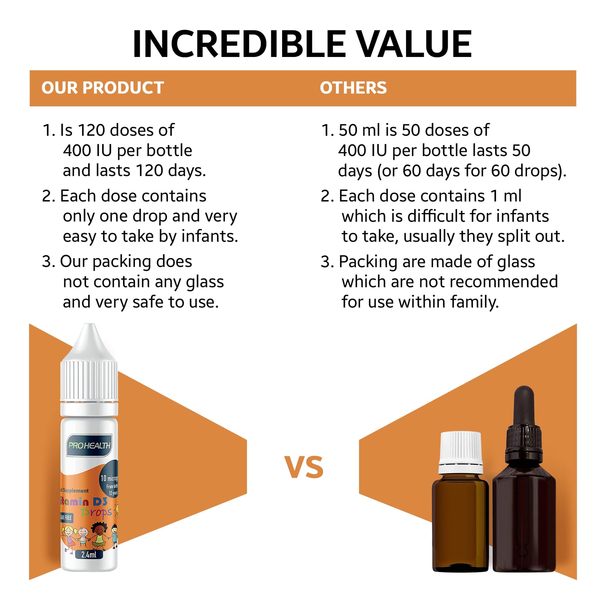 - ๐ ๐๐๐๐๐๐ ๐๐๐๐๐๐ ๐๐๐ ๐๐๐๐๐๐: Each tasteless drop provides the daily recommended amount of 400 IU (10 ยตg) of Vitamin D. Each bottle contains 120 daily drops providing incredible value keeping your child replenished with the correct level of Vitamin D3 to support the maintenance of normal bones, teeth and immune function for infants and young children
