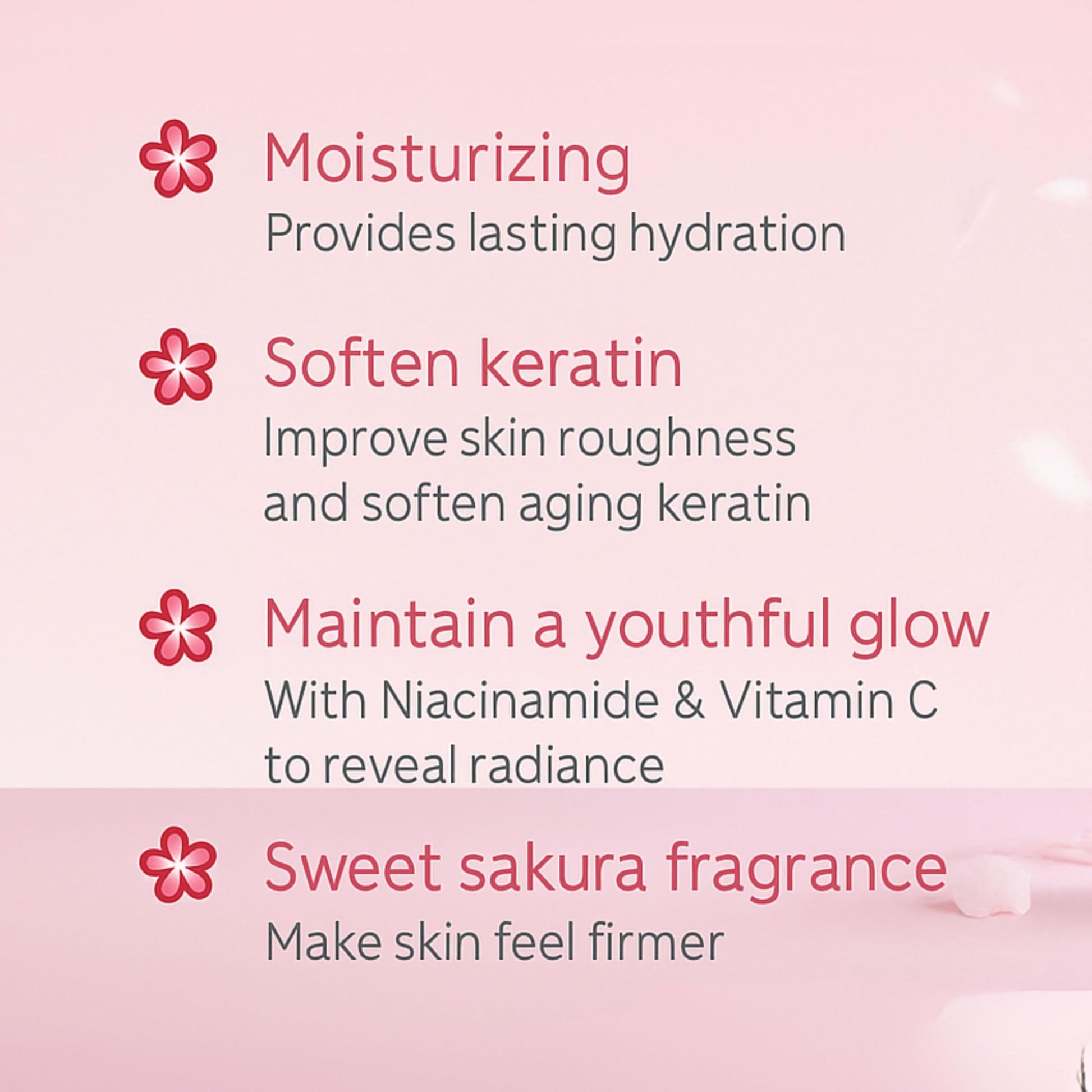 Indulge in the timeless elegance of Japanese cherry blossom skincare with this luxurious, glossy body lotion — your daily ritual for hydrated, radiant, and silky-soft skin. This beautifully textured gel-cream is enriched with a powerful blend of niacinamide, vitamin C, shea butter, rice extract, and real Sakura extract (Prunus Lannesiana Flower) to nourish and visibly refine your skin from the very first use. Designed to address dryness, dullness, and uneven tone, this firming hydrating body cream deeply moisturizes without heaviness. It glides effortlessly over the skin and absorbs quickly, leaving a smooth, non-sticky finish — ideal for day or night, and perfect for layering under fragrance or worn alone for a softly perfumed glow. Infused with real Sakura extract, this lotion leaves behind a soft, sweet Japanese cherry blossom aroma — delicate, floral, and beautifully romantic. It’s the kind of fragrance that lingers gently on the skin, evoking springtime serenity and effortless femininity. Over time, your skin appears brighter, more even, and supple, with improved texture and long-lasting moisture retention. Whether used as part of your morning beauty routine or as a calming self-care ritual at night, this Japanese Cherry Blossom Body Lotion transforms daily moisturizing into a luxurious sensory experience. 🟧 Why It Works 🌸 Japanese Cherry Blossom (Sakura Extract) – Provides a fresh, floral scent while calming and softening the skin 💧 Niacinamide – Helps reduce the appearance of pores, improve texture, and brighten uneven skin tone 🌿 Vitamin C – Supports skin elasticity and helps visibly reduce signs of dullness and discoloration 🧴 Shea Butter – Delivers deep, long-lasting moisture and restores softness 🍚 Rice Extract – Smooths and strengthens the skin barrier for a healthy, luminous finish 🟧 How to Use – Your Daily Ritual Apply generously to clean, dry skin — morning or night. Dispense 1–2 pumps and gently massage into areas like arms, legs, and décolletage. Focus on dry patches, such as elbows and knees, to soften and condition rough areas. Allow the lotion to absorb fully before dressing — no greasy residue, just soft, hydrated, delicately scented skin. Pro Tip: For best results, use after showering to lock in moisture and enhance the Sakura-scented glow all day. 🟧 Perfect For: Dry, dull, or uneven skin Floral scent lovers Lightweight daily hydration Firming and smoothing effect Daily use, all seasons Layering under fragrance or wearing alone ⚠️ Disclaimer: For external use only. Avoid direct contact with eyes. If irritation occurs, discontinue use. Store in a cool, dry place. Scent intensity may vary depending on skin type and body chemistry.More Info
