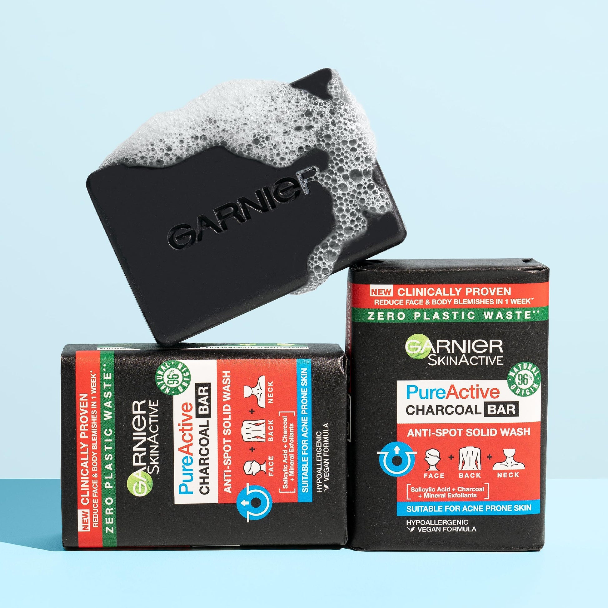 - GARNIER PURE ACTIVE CHARCOAL CLEANSING BAR: Reduces face and body blemishes in 1 week