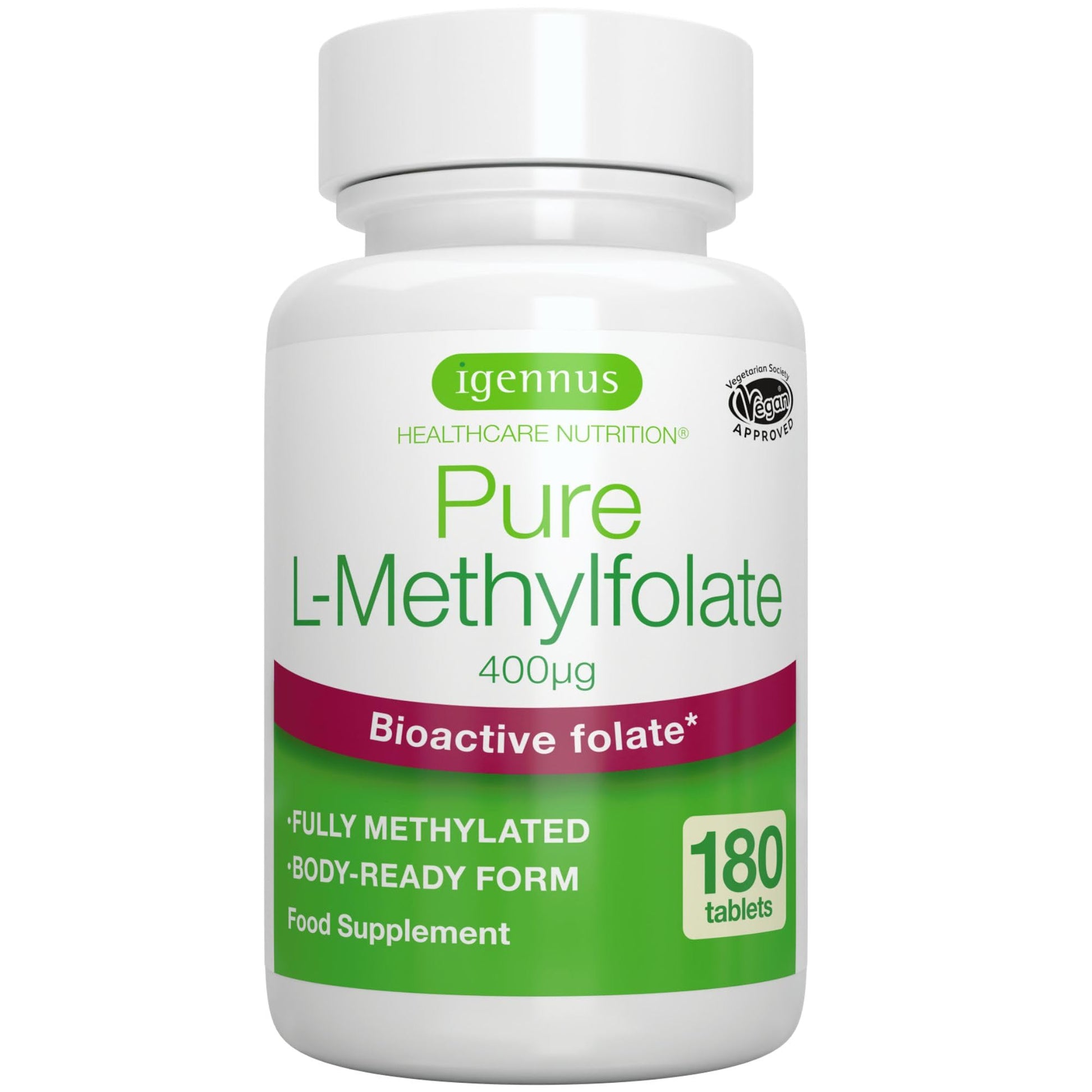 Pure Folate 400 mcg, 180 Small Tablets, Clean Ingredients & Vegan, Active Form of Folic Acid L-Methylfolate (Vitamin B9), Suitable for Pregnancy, One-a-Day, 180 Servings, by Igennus