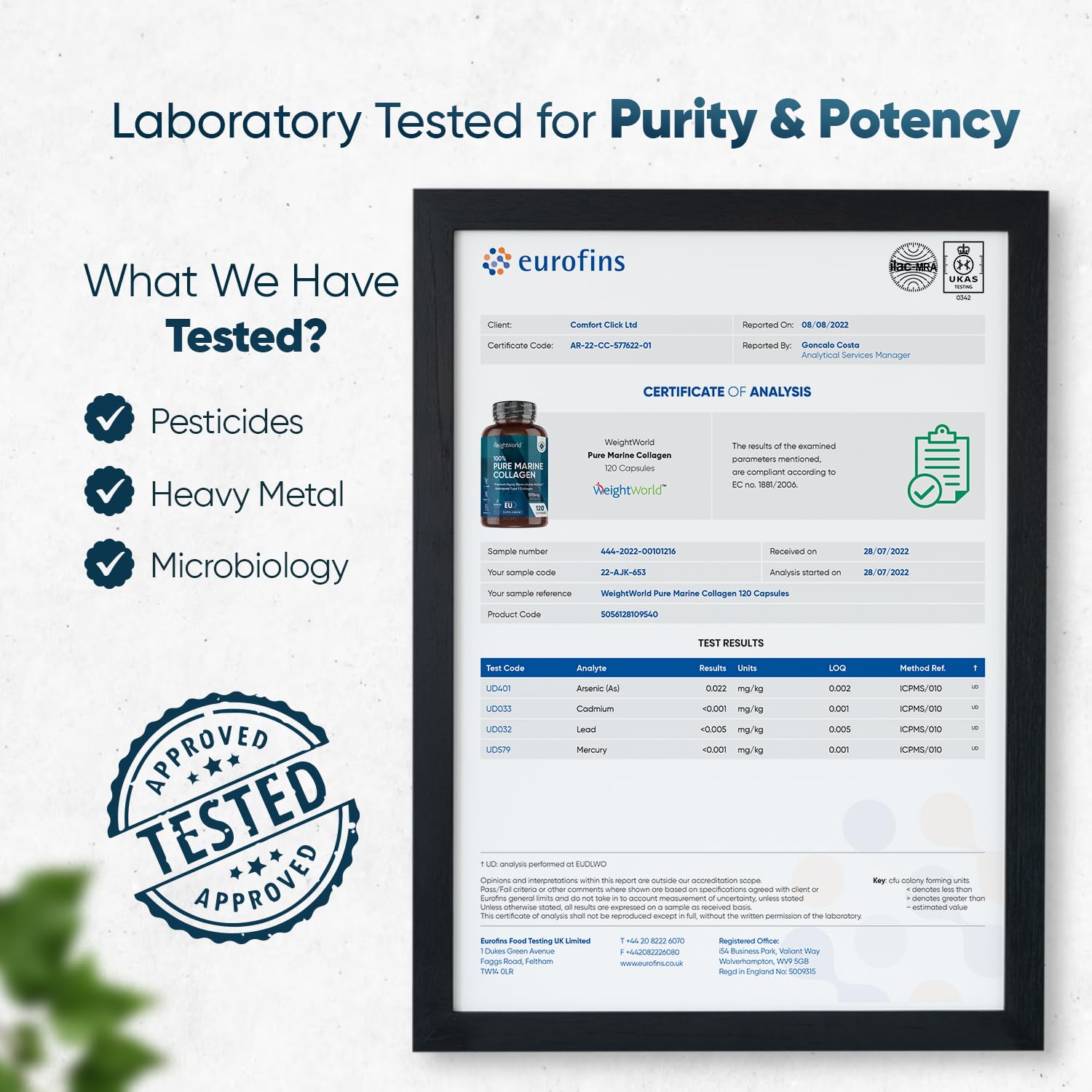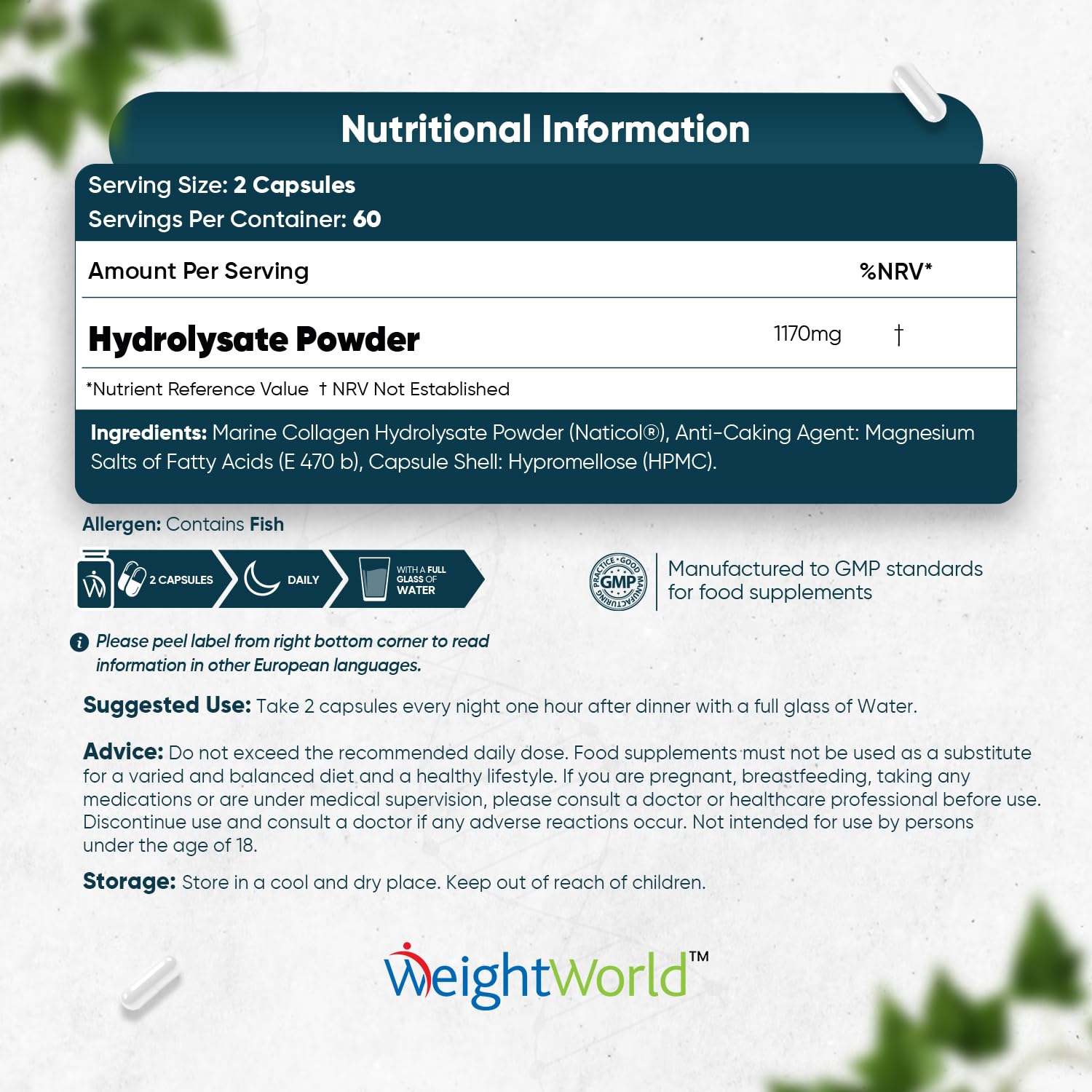 Pure Marine Collagen Capsules - 1170mg High Strength Collagen Supplement – 120 Type1 Hydrolysed Collagen Capsules - Collagen Supplements for Skin, Hair & Joints – Unflavoured & Odourless - Made in EU Hydrolysed Collagen for Maximum Absorption – WeightWorld hydrolysed marine collagen supplements is derived from wild fish that are sustainably sourced from the deep sea for higher quality collagen peptide, that is free from hormones and heavy metals. Our fish collagen supplement contains premium "NATICOL" Type I hydrolysed collagen peptides to ensure higher absorption ratios. Beautiful & Healthier You! – Collagen is the basic building block and helps in maintaining the normal functioning of joints, muscles, skin, hair and bones. Our collagen supplement provides benefits of joint care supplements as well as hair skin and nails supplement into one easy to take serving. Adding our high strength collagen supplements for women and men that provides 1170mg of pure marine collagen per serving to your diet is the key to look & feel amazing every day. 100% Pure, Unflavoured and Odourless - WeightWorld hydrolysed collagen pills for men and women are free from nasty fillers, binders, heavy metals, hormones, GMO, gluten and artificial additives. They are unflavoured and hence do not leave unwanted aftertaste. Our marine collagen capsules(not marine collagen tablets) are also suitable for ketogenic diet as unflavoured collagen peptides are rich in amino acids which play a part in maintaining a healthy keto diet.More Info