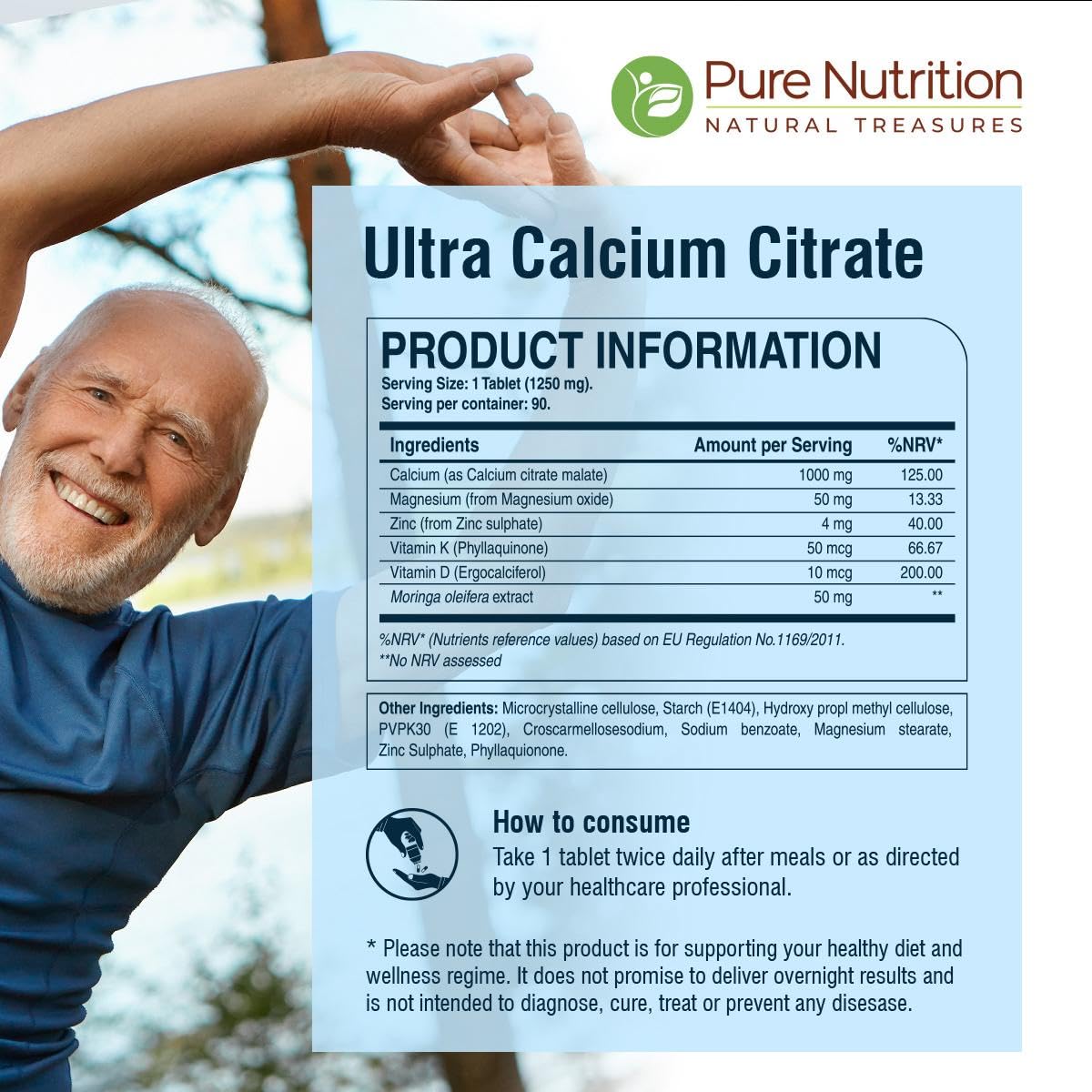 Pure Nutrition's Ultra Calcium Citrate helps maintain calcium levels. Minerals like zinc and magnesium also help in mineralization and collagen synthesis. Dosage: 1 tablet daily after meals Pure Nutrition's Ultra Calcium Citrate helps to manage rapid depletion of calcium levels. Contains 1000 mg Calcium Citrate, 400IU Vitamin D, 50 mg Magnesium Oxide, 50 mg Vitamin K27, 50 mg Moringa Oleifera, 4 mg Zinc SulphateMore Info