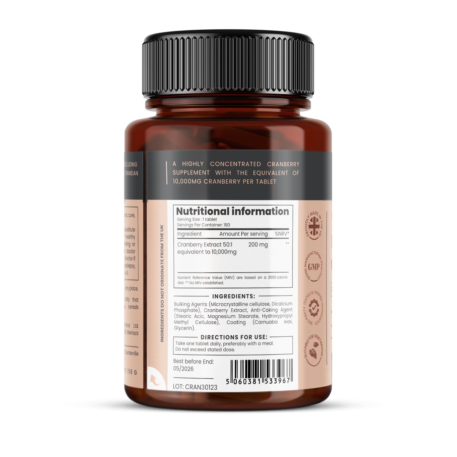 DOUBLE STRENGTH – Each tablet contains 10,000mg of pure cranberry extract, which is double the strength of other leading brands, that typically provide 5000mg or less per tablet. ALL THE GOODNESS OF CRANBERRY WITHOUT THE SUGAR – Cranberries have a very tart taste that for most people is unpalatable. To hide this taste most Cranberry products are loaded with added sugar which means that in terms of your health you are taking one step forward and two steps backward. With our concentrated tablets you can experience all of the benefits of Cranberry with zero sugar. NATURALLY RICH IN FLAVANOIDS – NATURALLY RICH IN FLAVANOIDS –Each tablet packs in an effective dose of all the beneficial parts of the cranberry fruit, including vitamins A, C, and E, and various phytochemicals. This includes a high percentage of the anthocyanidin nutrient known as PAC Type A (proanthocyanidins), ensuring that you get maximum benefit from each serving. EXCEPTIONAL VALUE – 6 MONTHS SUPPLY! – Most Cranberry products come in bottles of 60 – 100 tablets. Our product contains 180 tablets per bottle and you only need to take 1 tablet per day. Each bottle lasts 6 months and at this price you are getting twice the value. QUALITY TESTED AND ASSURED - To offer an assurance of exceptional quality, we not only sourced the purest ingredients but we spent two years finding the right manufacturing partners that held the same ideals as us. All of our supplements are made in multi-million dollar state of the art facilities across the world. Every step of the supply chain is tested and analysed along the way, and before and after product.More Info
