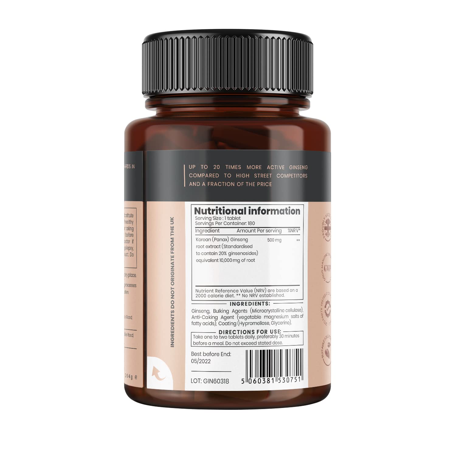 3. Concentrated 20: 1 extract so each tablet contains the equivalent of 10,000mg regular Ginseng root powder.