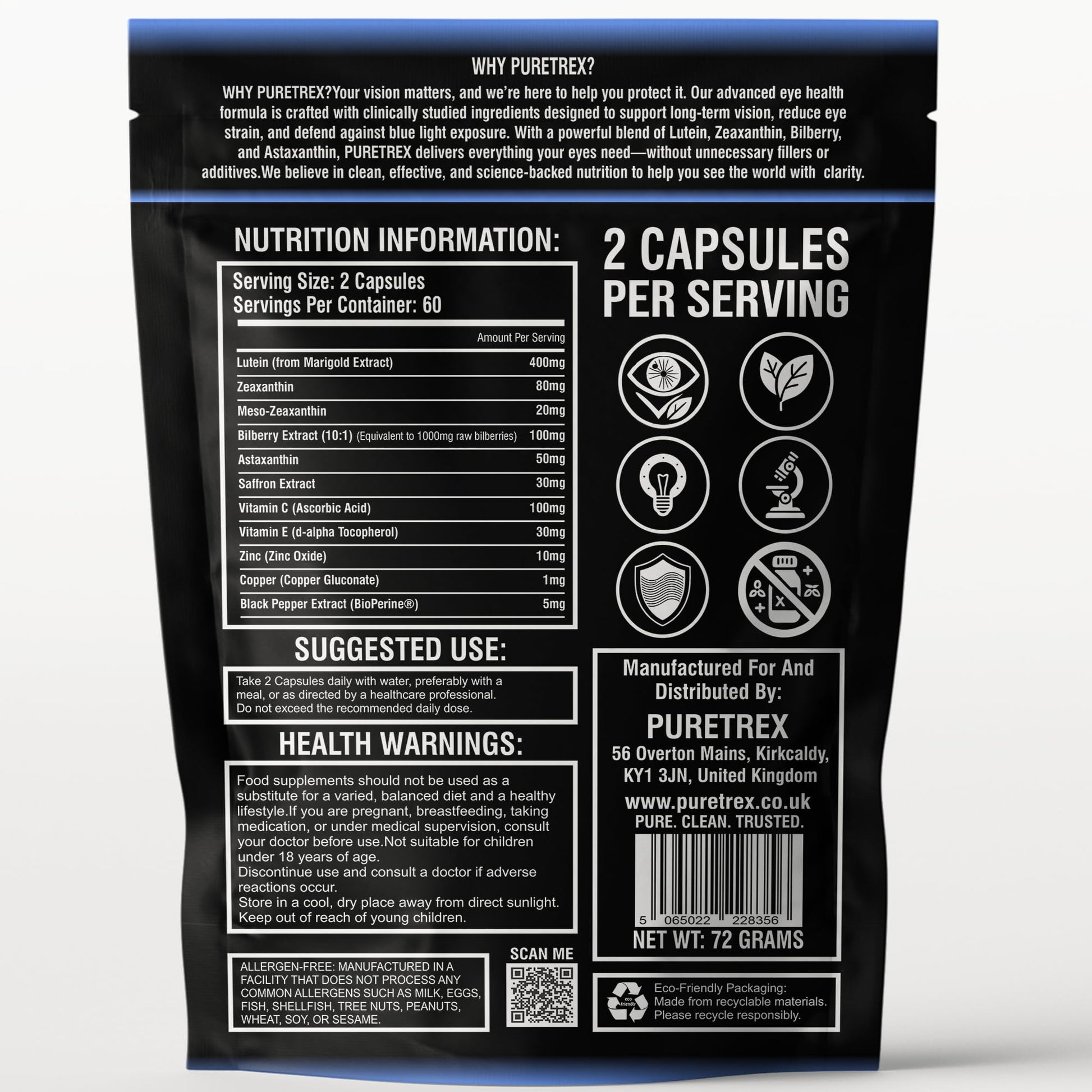 Your eyes face daily challenges — from screen exposure and UV rays to oxidative stress and aging. That’s why Puretrex Eyeshield 360 was created: a powerful, science-backed eye health supplement crafted to help protect and nourish your vision from all angles. Each serving delivers a full-spectrum formula with clinically studied ingredients that target the root causes of eye fatigue, vision decline, and blue light strain. At the heart of this formula is a potent blend of Lutein (400mg), Zeaxanthin (80mg), and Meso-Zeaxanthin (20mg) — carotenoids essential for macular health and long-term eye protection. To further support healthy vision, we've included Bilberry Extract, known for improving night vision and circulation to the eyes, along with Saffron Extract and Astaxanthin, two premium antioxidants with proven benefits for reducing oxidative damage and supporting retinal function. Added to this are Vitamin C, Vitamin E, Zinc, and Copper — key nutrients involved in protecting delicate eye tissues and supporting overall eye structure and function. The formula is enhanced with BioPerine (Black Pepper Extract) to boost absorption and ensure your body utilizes every ingredient efficiently. Whether you're working on a screen all day, driving at night, or simply aiming to preserve your eyesight for the years ahead, Eyeshield 360 offers comprehensive protection and daily nourishment for optimal eye comfort, clarity, and longevity. Made in the UK with zero fillers, artificial colours, or preservatives — just clean, effective, and targeted eye nutrition.More Info