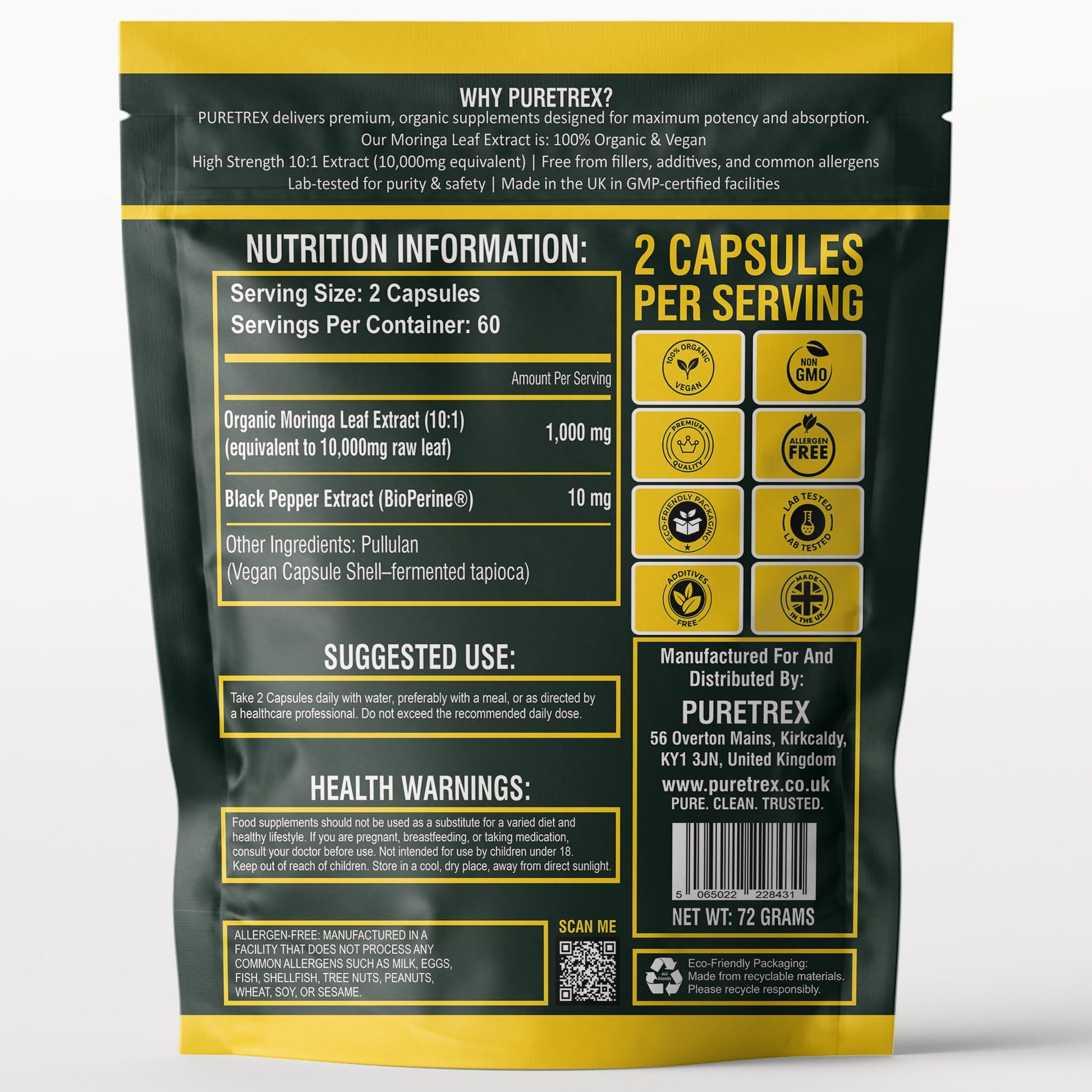 Puretrex Moringa Leaf Extract 10,000mg | 120 Vegan Capsules | Organic, Non-GMO | High Strength Superfood Supplement | Made in UK | Natural Energy & Immunity Support