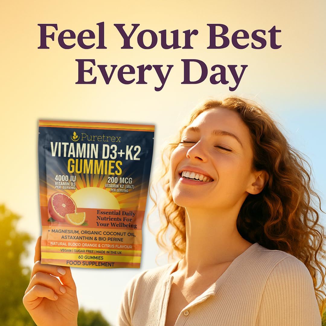Say hello to your new daily wellness ritual 🌞 — PURETREX Vitamin D3 + K2 Gummies deliver a powerful and clean blend of essential nutrients in a delicious blood orange & citrus flavour. Each 1-gummy serving packs 4000 IU of vegan Vitamin D3 (from lichen) and 200 mcg of premium Vitamin K2 MK-7 (from chickpea fermentation) to support strong bones, immune health, and cardiovascular function. But we don’t stop there. This advanced formula also features: Magnesium citrate for nerve, muscle, and energy support ⚡ Organic coconut oil for better vitamin absorption 🥥 Astaxanthin (from natural algae), a powerful antioxidant for skin and cellular protection 🌺 BioPerine (black pepper extract) to maximize nutrient bioavailability 🚀 All packed in a vegan, sugar-free, non-GMO gummy with zero artificial colours or synthetic fillers. Proudly made in the UK under the highest manufacturing standards, our gummies are designed for women and men who want real results — without compromise. PURETREX means PURE. CLEAN. TRUSTED. 💪