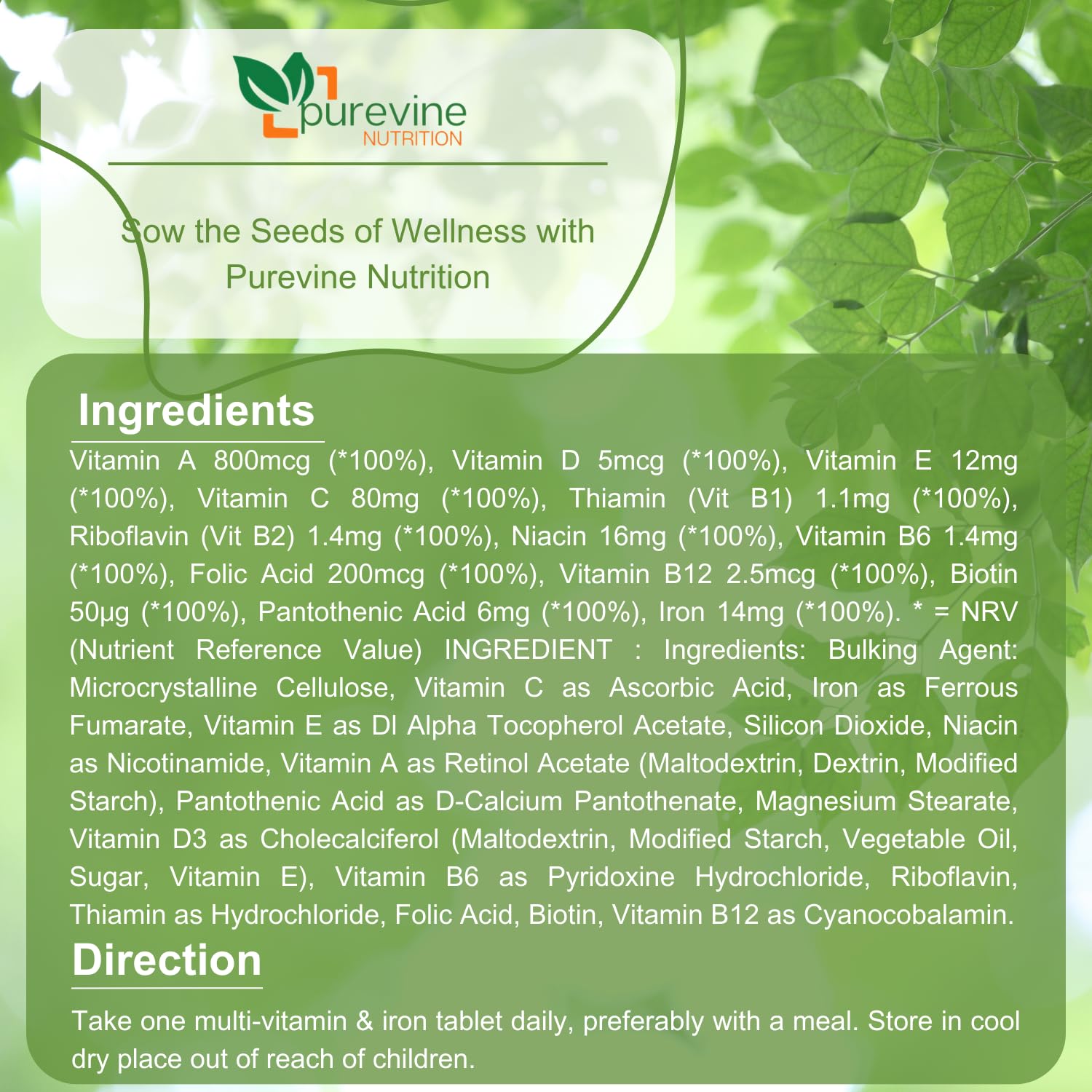 Purevine Nutrition Multi Vitamins with Iron Supplement - 180 Tablets - Daily One A Day Multivitamin with Vitamin C, B, A and D – Immune Support Suitable for Men and Women - UK Manufactured to GMP Standards