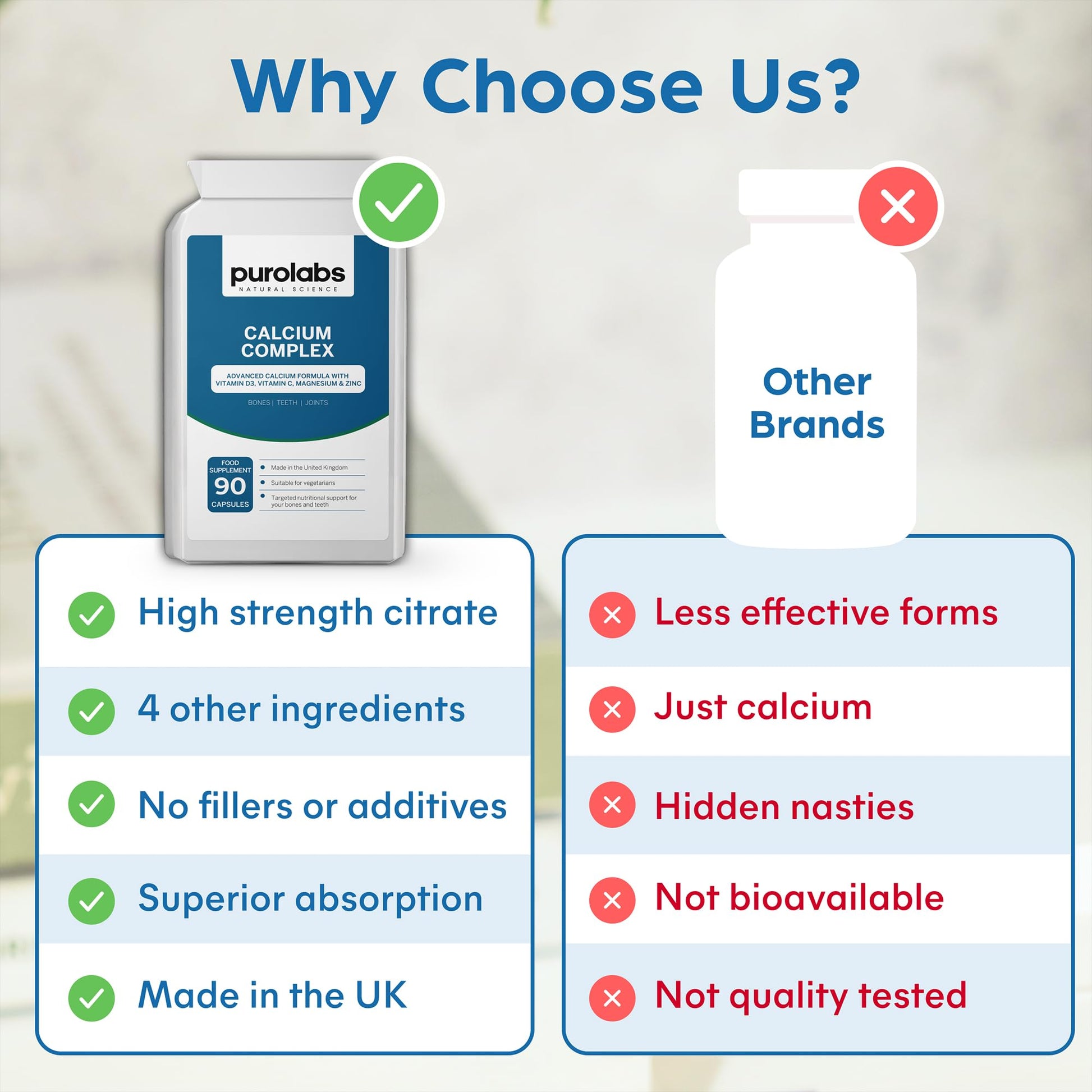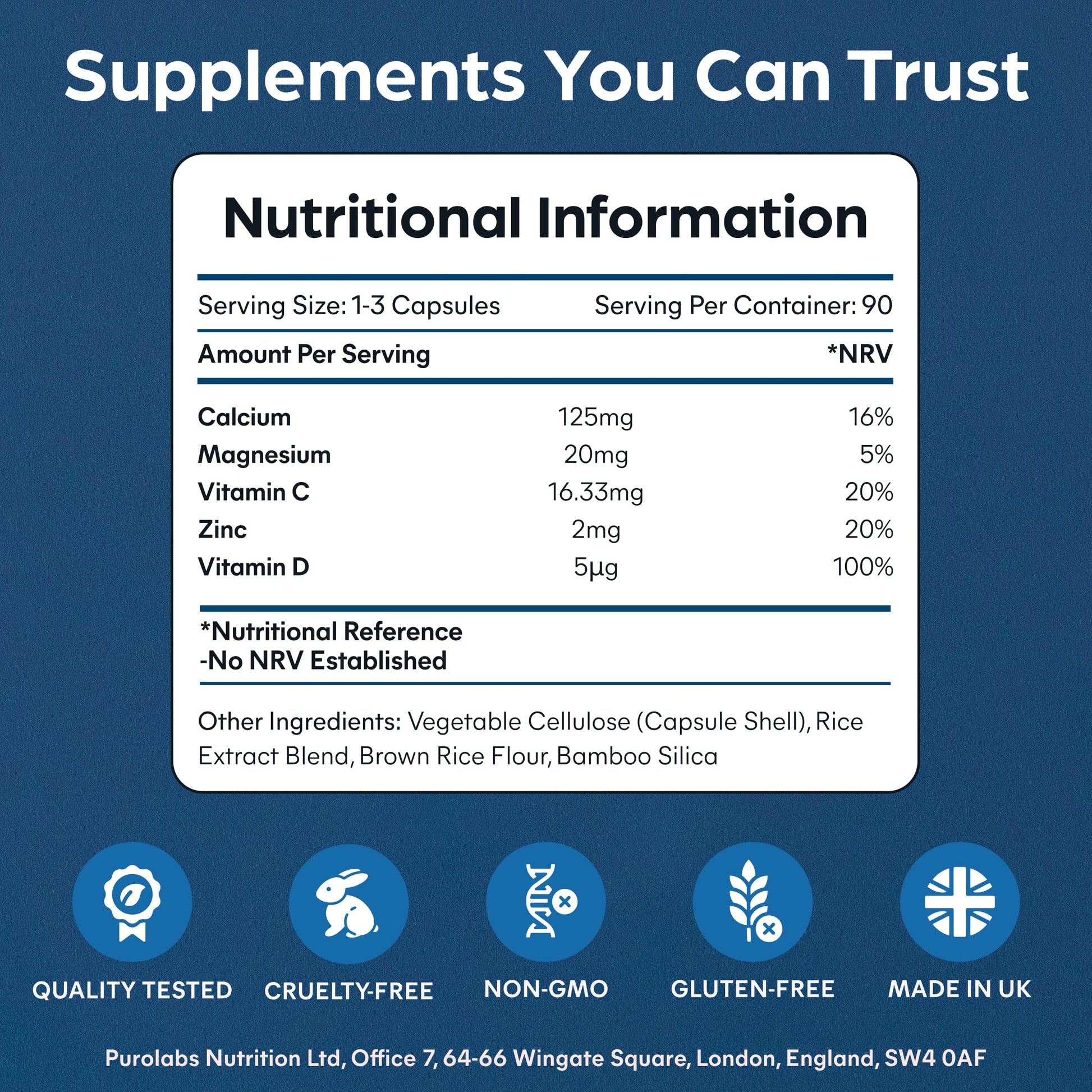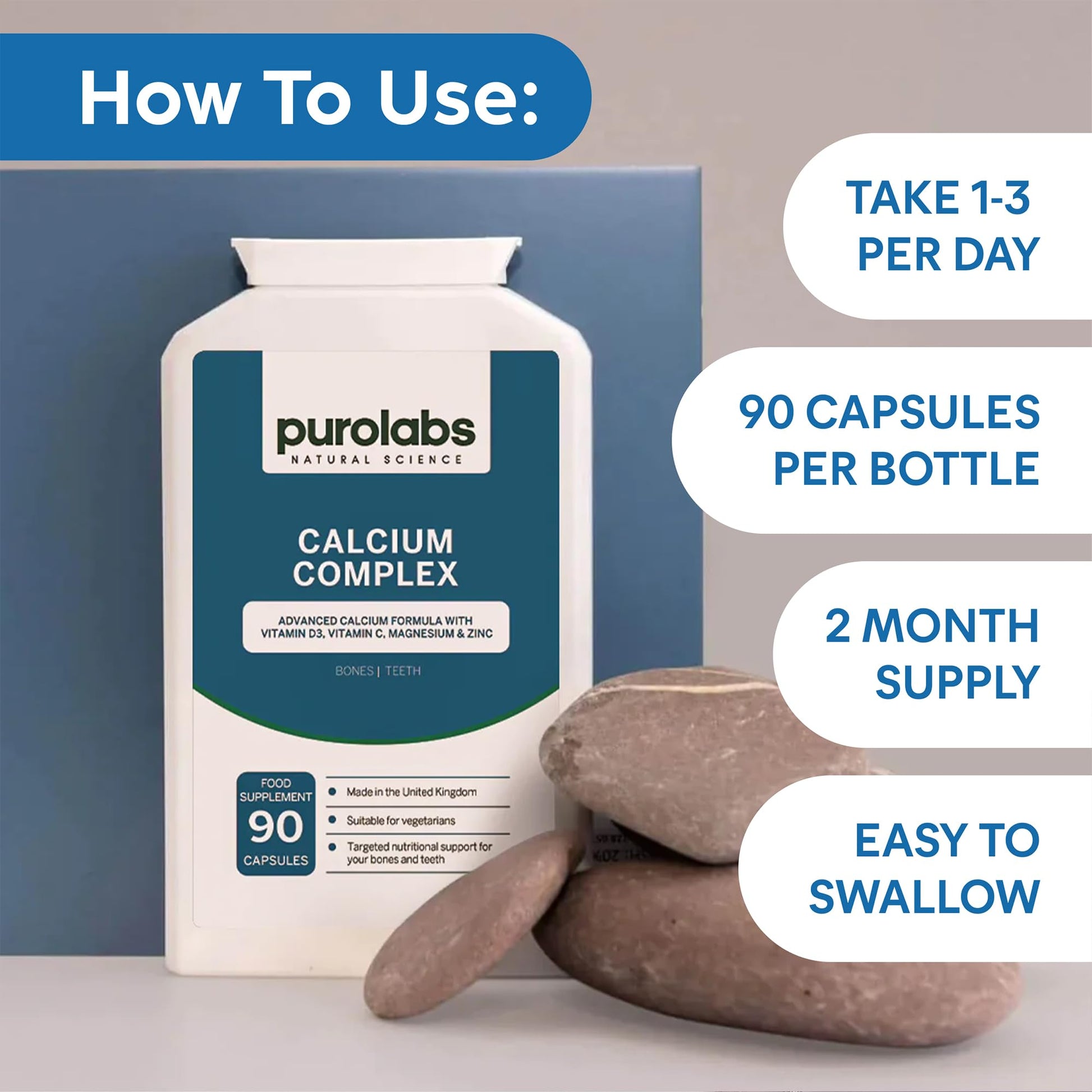 Purolabs Calcium Complex - High Strength Bone Support with Vitamin D3, Magnesium, Zinc & Vitamin C - Optimal Absorption Formula for Women & Men - 90 Capsules