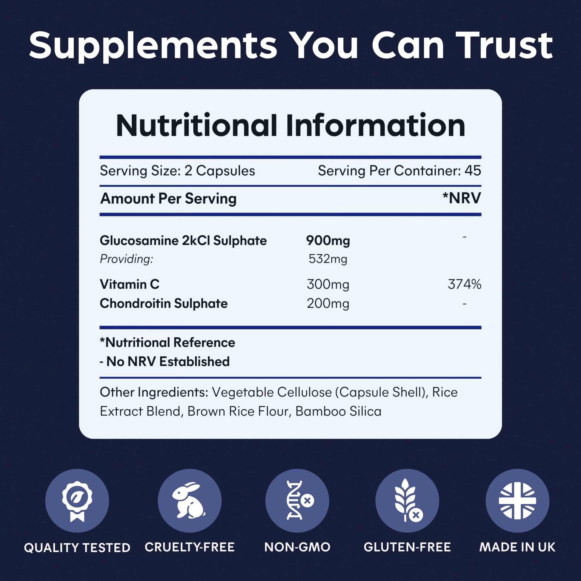 Support your joint health as part of a balanced lifestyle with our High Strength Glucosamine, Chondroitin & Vitamin C Complex. Glucosamine, chondroitin, and vitamin C are known to contribute to general joint health and well-being. This expertly formulated supplement contains 900mg of glucosamine sulfate, providing 532mg of glucosamine base, along with 200mg of chondroitin sulfate and 300mg of vitamin C. Our unique blend of these ingredients is designed to support overall joint comfort, flexibility, and mobility. The glucosamine and chondroitin used are highly bioavailable, ensuring effective absorption, while the added vitamin C helps enhance the efficacy of these key nutrients. Each bottle provides a 45-day supply with 90 easy-to-swallow capsules, offering 2 capsules per day for continued joint support. Manufactured in an ISO 22000 certified facility, our supplement is non-GMO, gluten-free, and contains no artificial additives. Each batch is third-party lab tested for purity and potency, giving you confidence in the quality of the product. This product is not intended to diagnose, treat, cure, or prevent any disease.More Info