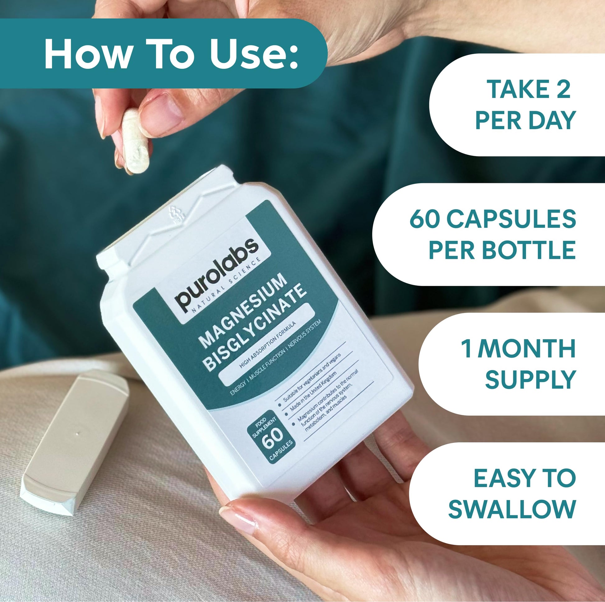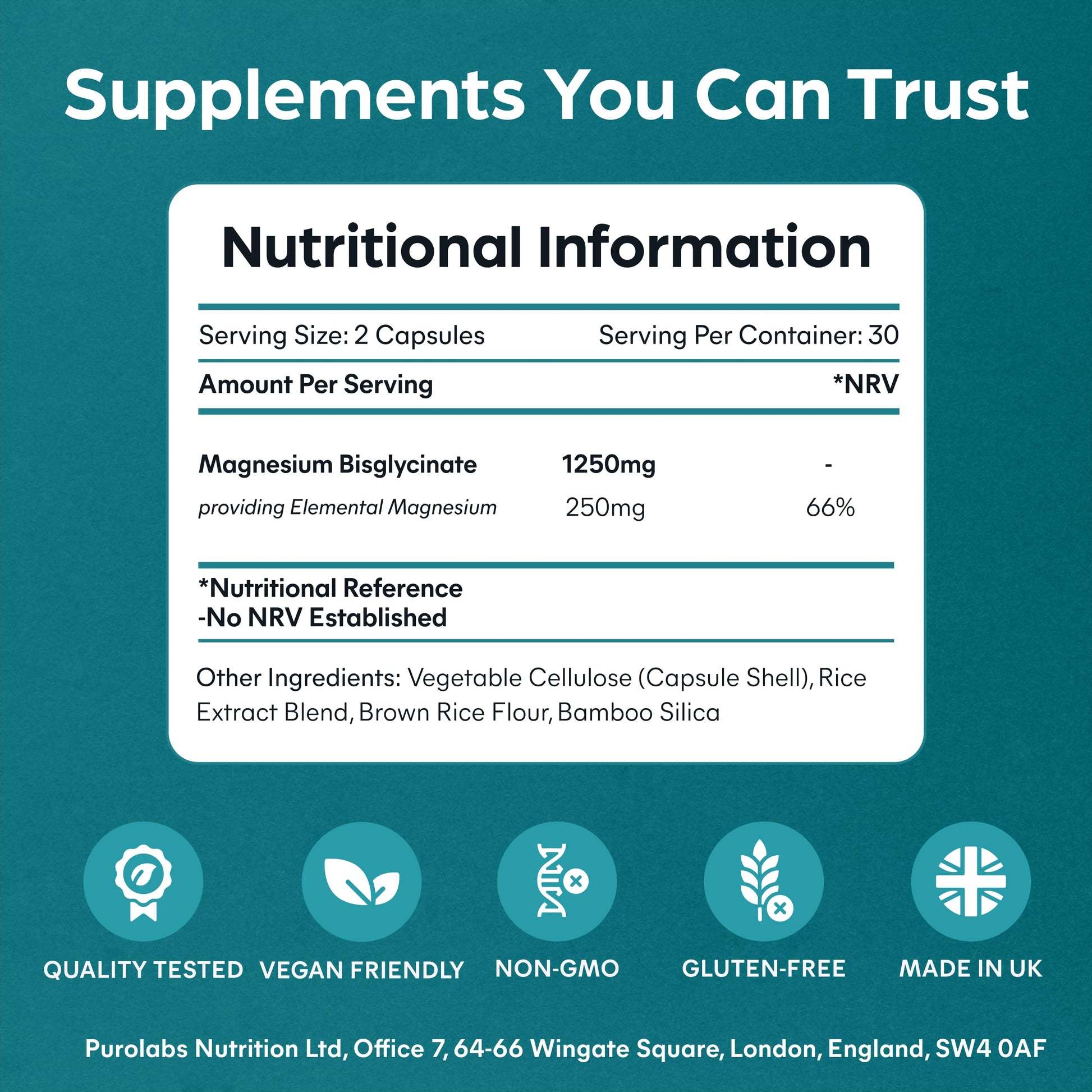 Purolabs Magnesium Bisglycinate 250mg | High Absorption | Energy, Sleep & Muscle Support | Gentle on Stomach | Vegan, Non-GMO, Allergen-Free | 60 Capsules | Made in UK