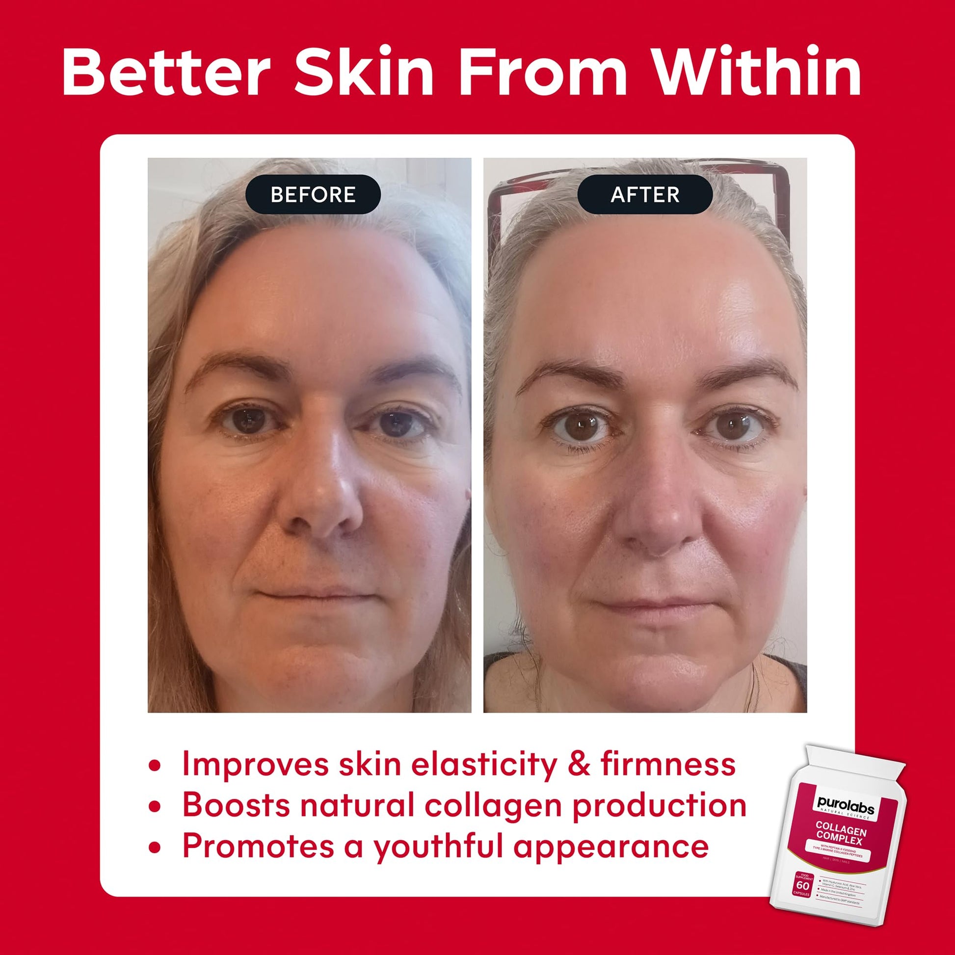 YOUR SKIN SUPERHERO - Experience the transformative power of Purolabs Collagen Complex, the ultimate skin saviour. Clinically proven to improve skin elasticity and boost moisture, it visibly firms, tightens and smoothens your skin in just 4 weeks. Say goodbye to wrinkles and hello to a radiant, age-defying glow.UNLEASH YOUR GLOW - Rediscover your natural radiance with Purolabs collagen tablets. This advanced formula of hydrolysed marine collagen replenishes and nourishes your skin from within, erasing fine lines, wrinkles, and signs of premature ageing.