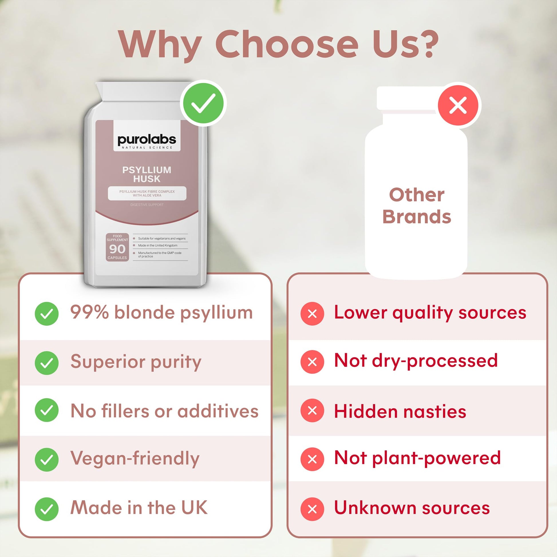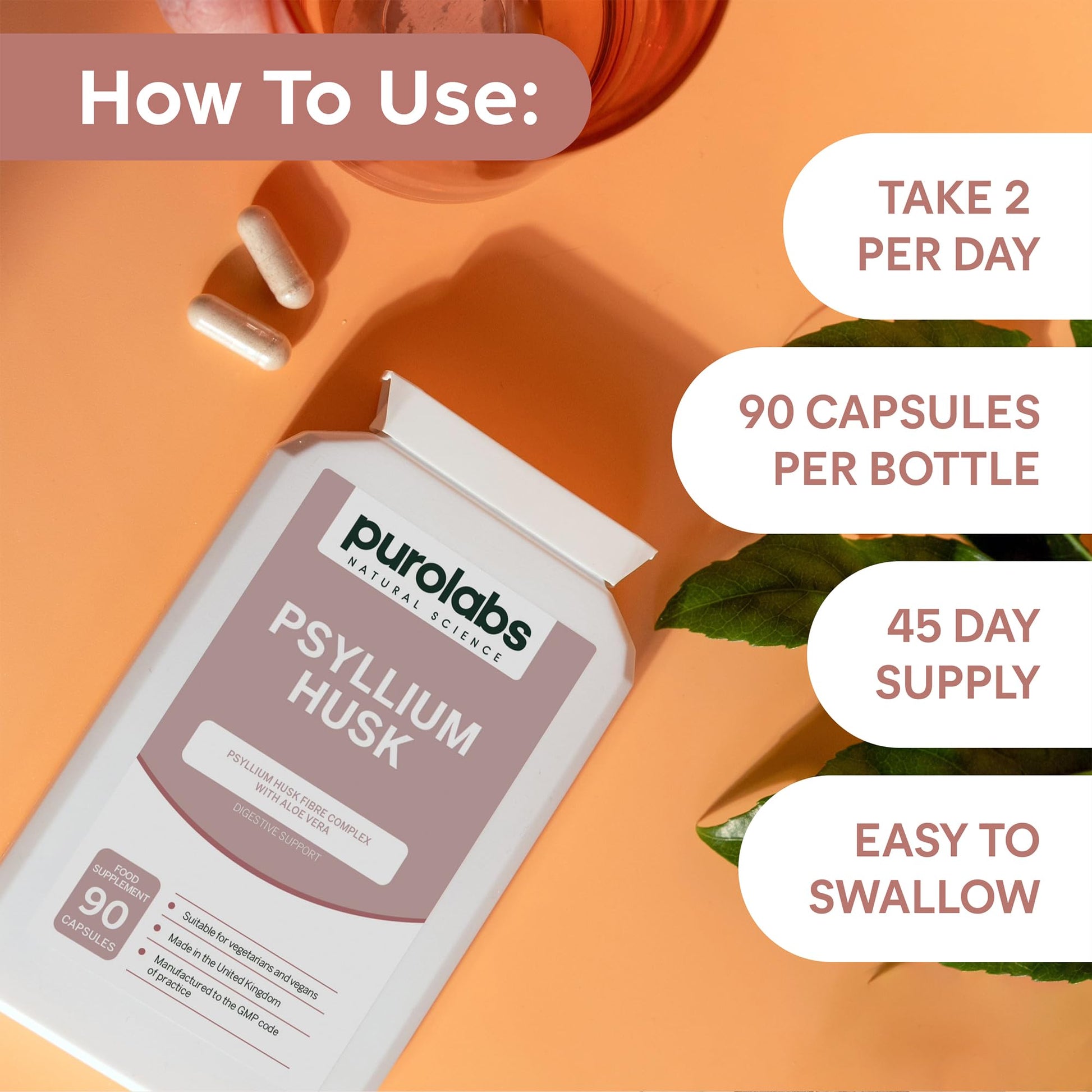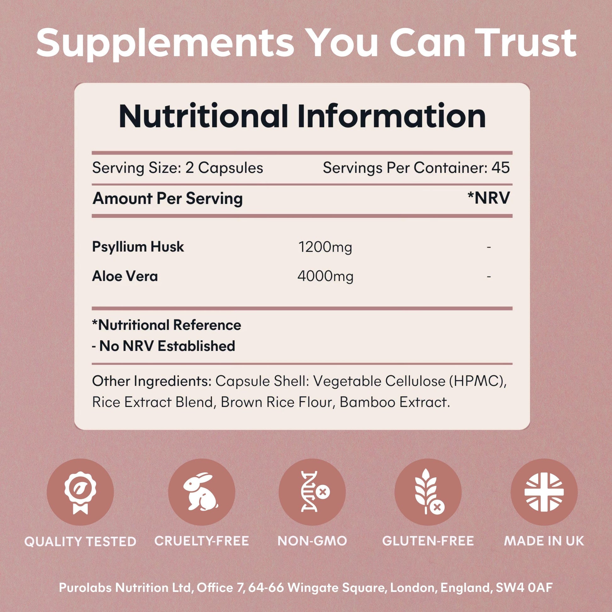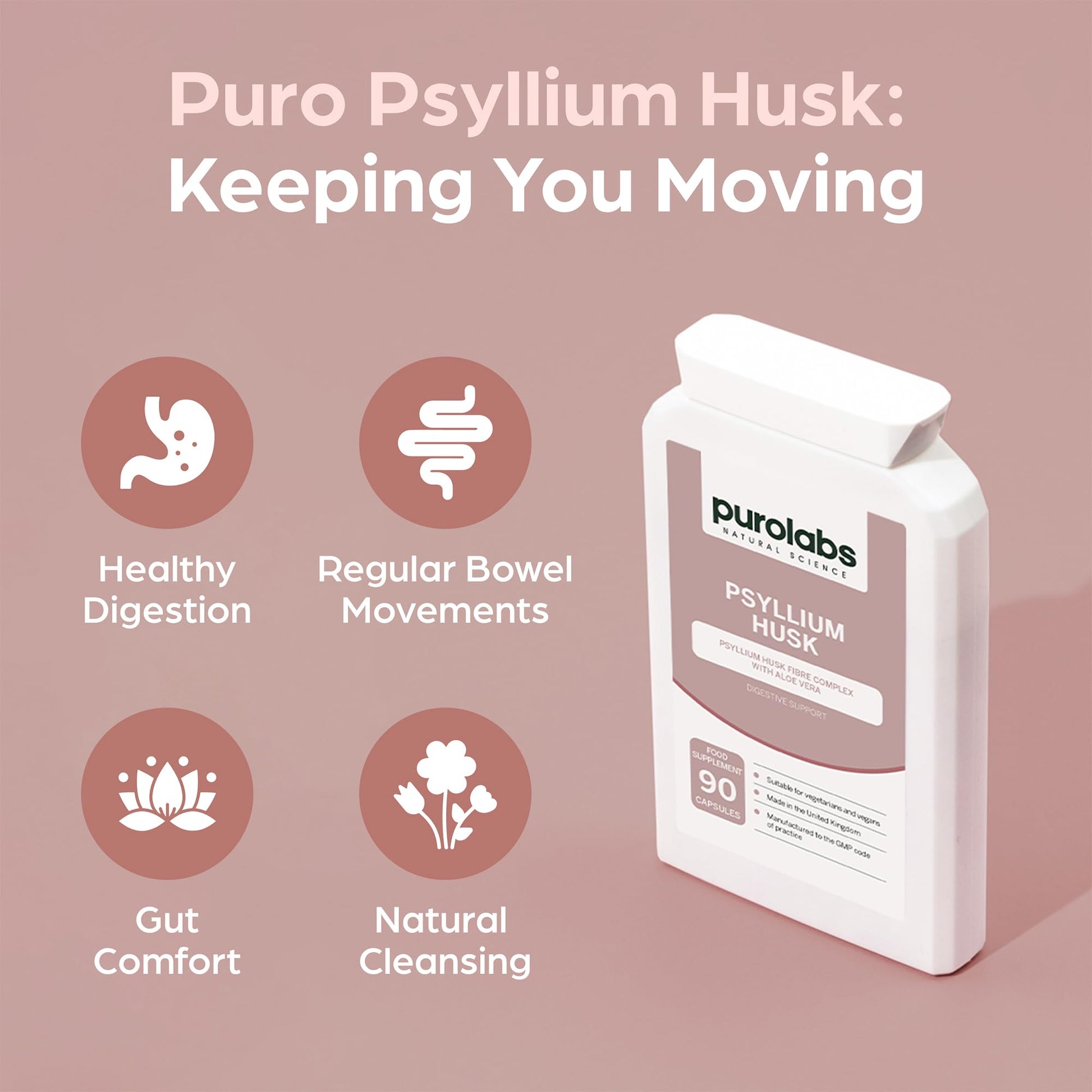 Purolabs Psyllium Husk Complex - High Purity 99.9% Fibre Supplement with Aloe Vera - Natural Digestive Support - Gut Health & Bowel Regularity - 90 Capsules