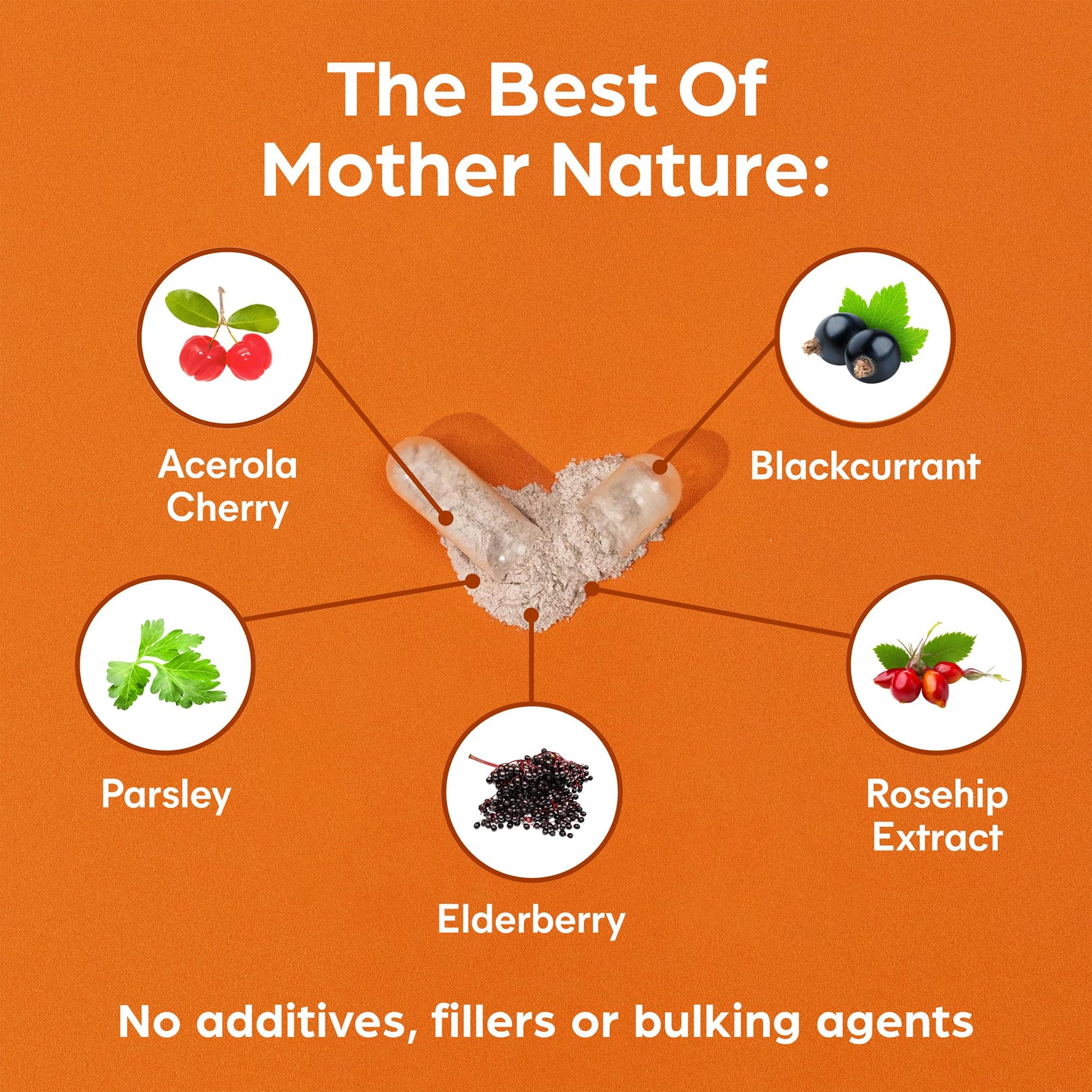 NATURAL VITAMIN C COMPLEX - Experience the power of nature with our wholefood vitamin C. Sourced from acerola cherries and complementary superfoods, our formula delivers 125mg (156% NRV) of naturally occurring vitamin C per capsule, complete with beneficial bioflavonoids and co-factors.SUPERIOR ABSORPTION - Unlike synthetic alternatives, our food-based vitamin C is gentle on the stomach and highly bioavailable. The natural complex from acerola cherry, rosehip, blackcurrant, and elderberry provides vitamin C in its most effective form, exactly as nature intended.