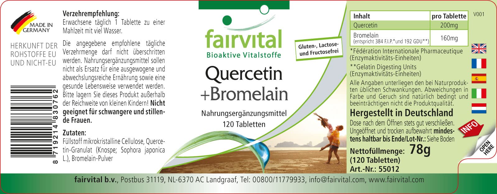 The combination of quercetin with bromelain is called synergistic, which means that the effect is greater than the sum of the effects seen when each substance is given alone. Each tablet contains 200 mg quercetin and 160 mg bromelain. Fairvital recommends taking one tablet daily with a meal. Safe dosage.
