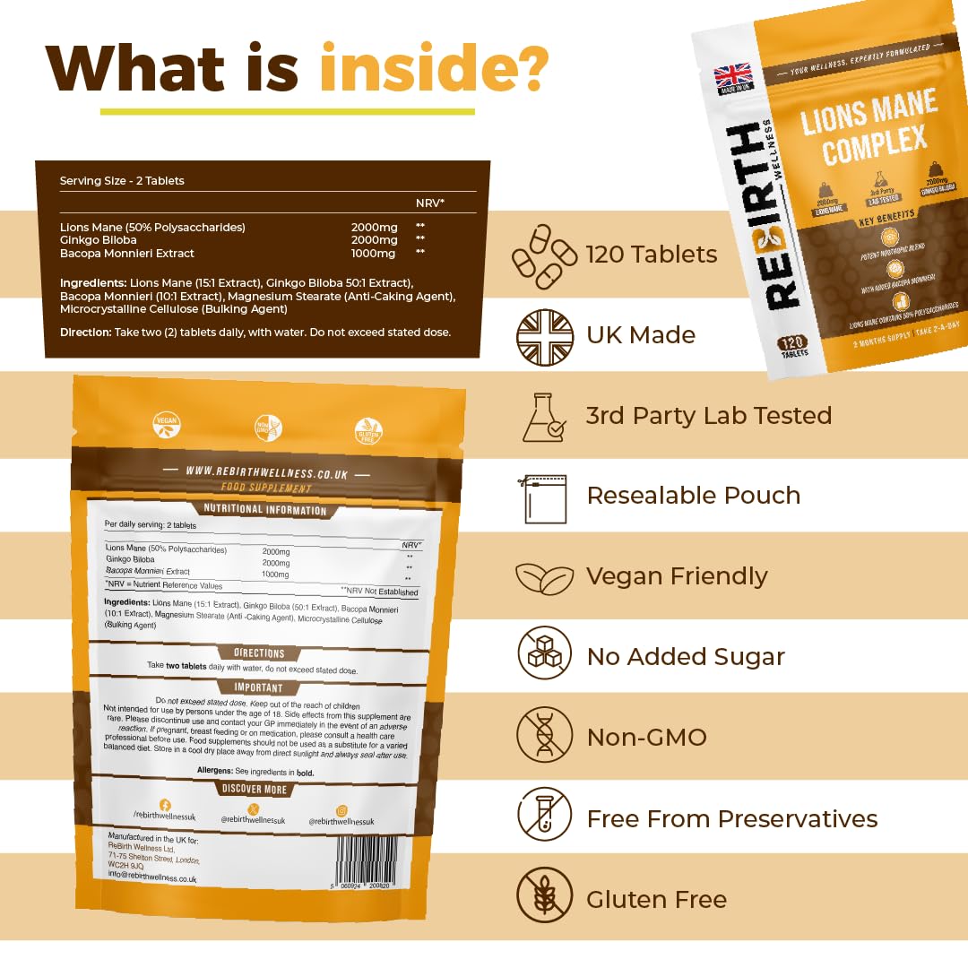 REBIRTH WELLNESS BE YOURSELF | ONLY BETTER Lions Mane Supplement - 2000 mg Lion's Mane (50% Polysaccharides), 2000 mg Ginkgo Biloba & 1000 mg Bacopa Monnieri - Nootropics Supplement - 120 Small Vegan Tablets - UK Made - 3rd Party Lab Tested