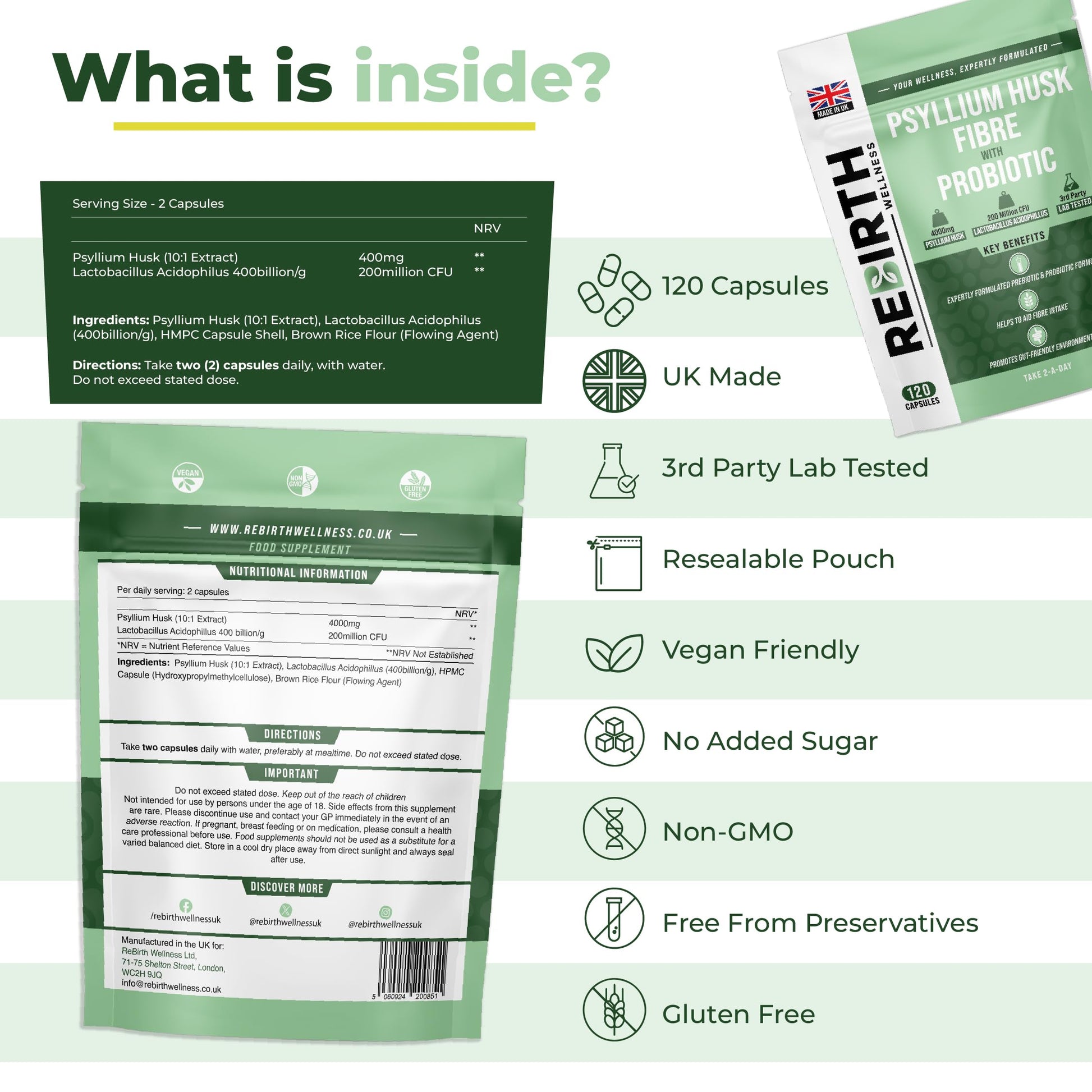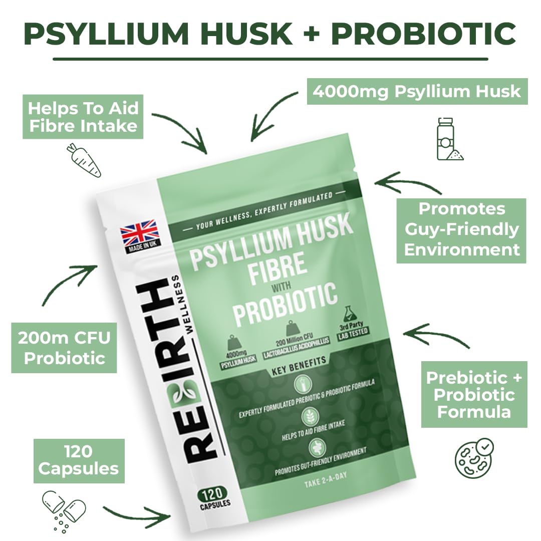 REBIRTH WELLNESS BE YOURSELF | ONLY BETTER Psyllium Husk Fibre Supplement 4000mg with Probiotic Acidophilus – 120 Capsules, High Fiber Supplement for Digestion & Gut Health,3rd Party Lab Tested, UK Made by Rebirth Wellness
