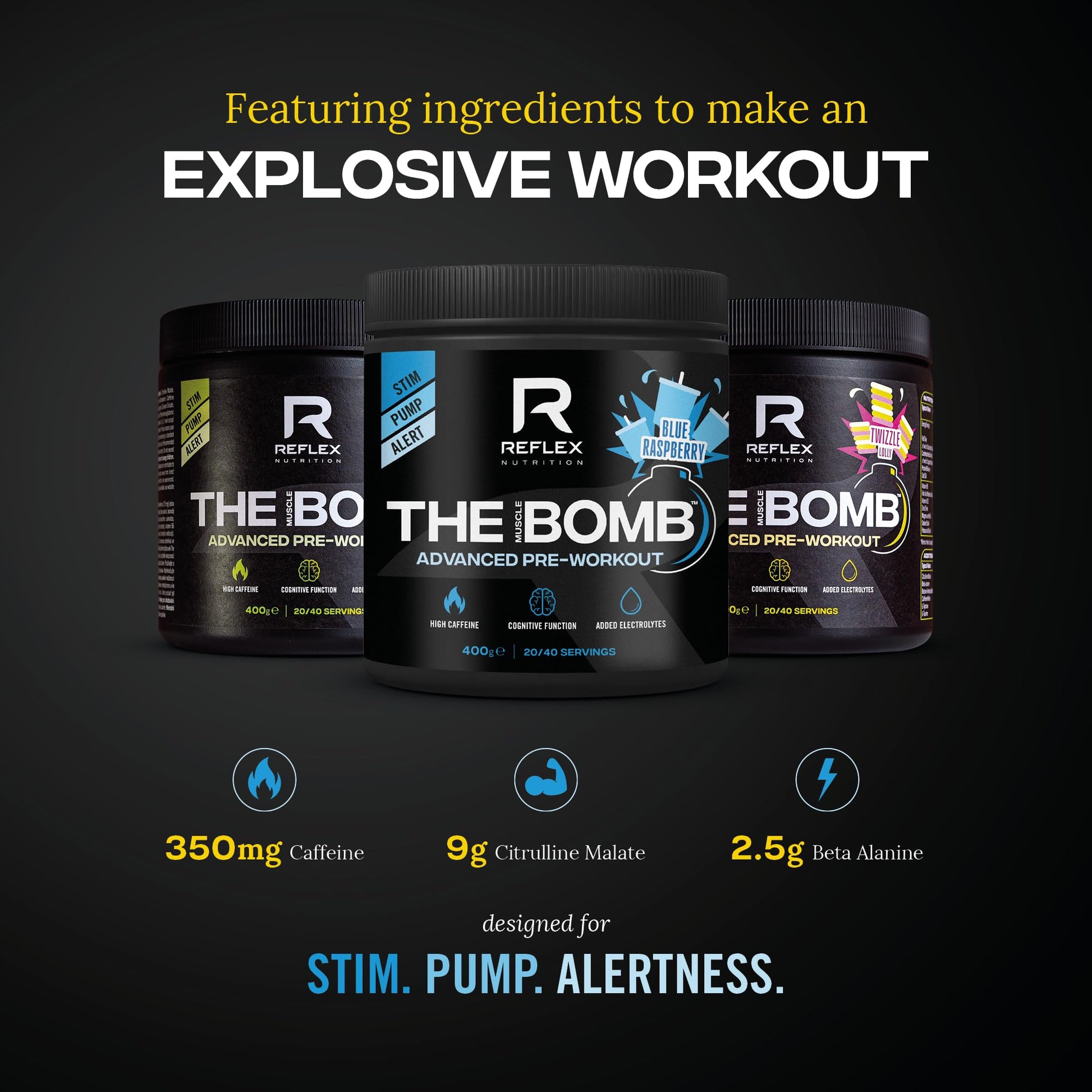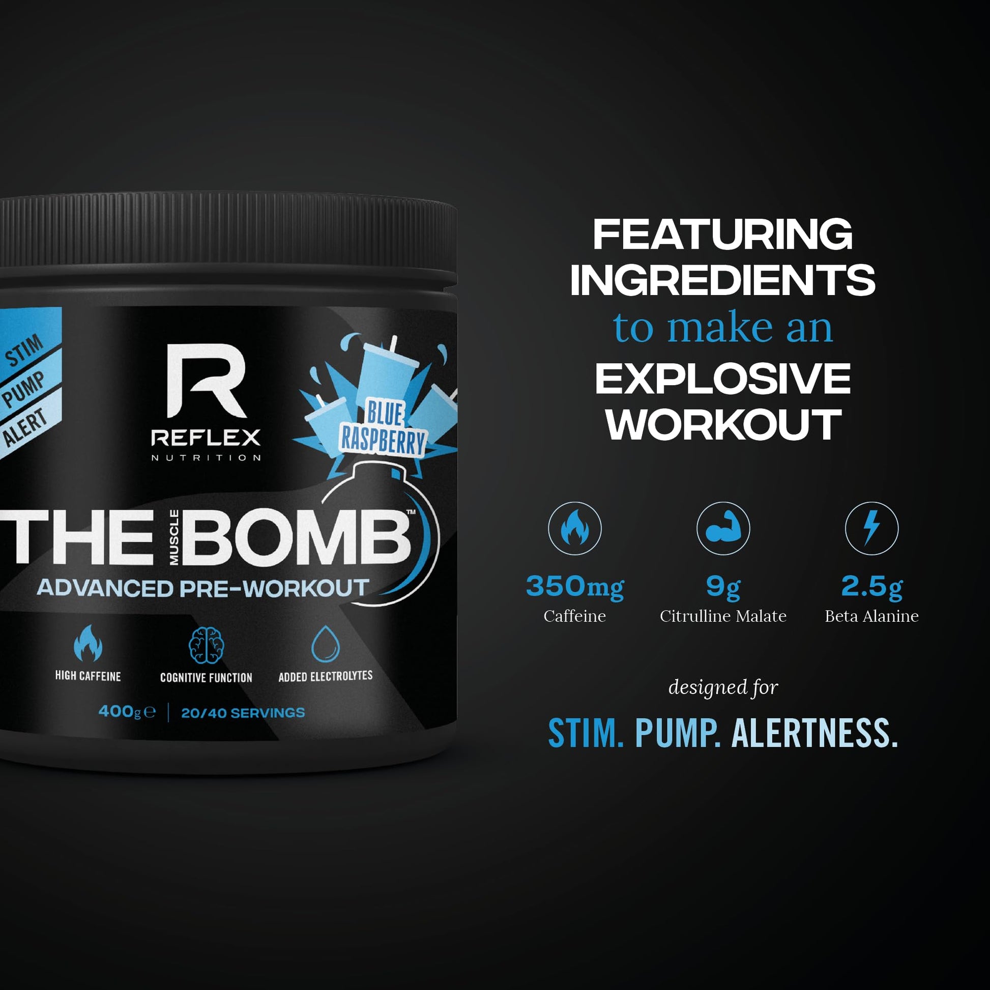 Reflex Nutrition Pre Workout The Muscle Bomb 350G Caffeine 9G Citrulline Malate 2.5G Beta Alanine Added Hydration Electrolytes (Blue Raspberry, 400G)