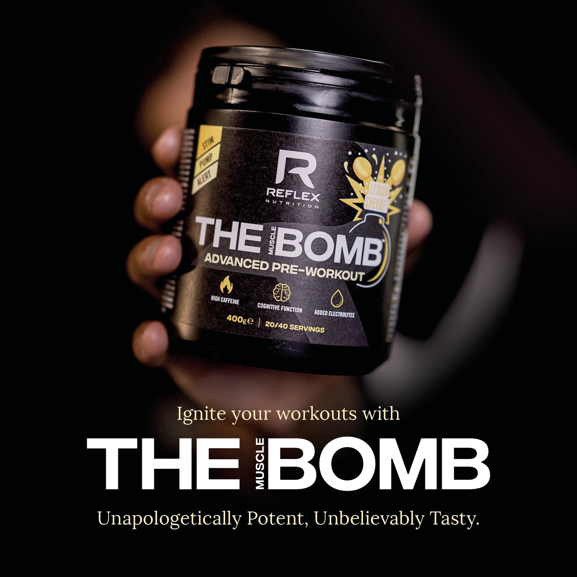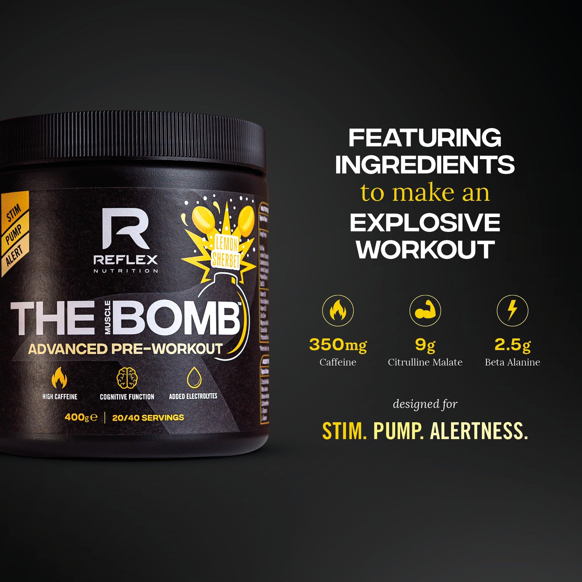 Reflex Nutrition Pre Workout The Muscle Bomb Caffeine Free 9G Citrulline Malate 2.5G Beta Alanine Added Hydration Electrolytes (Sherbet Lemon Caffeine Free, 400G)