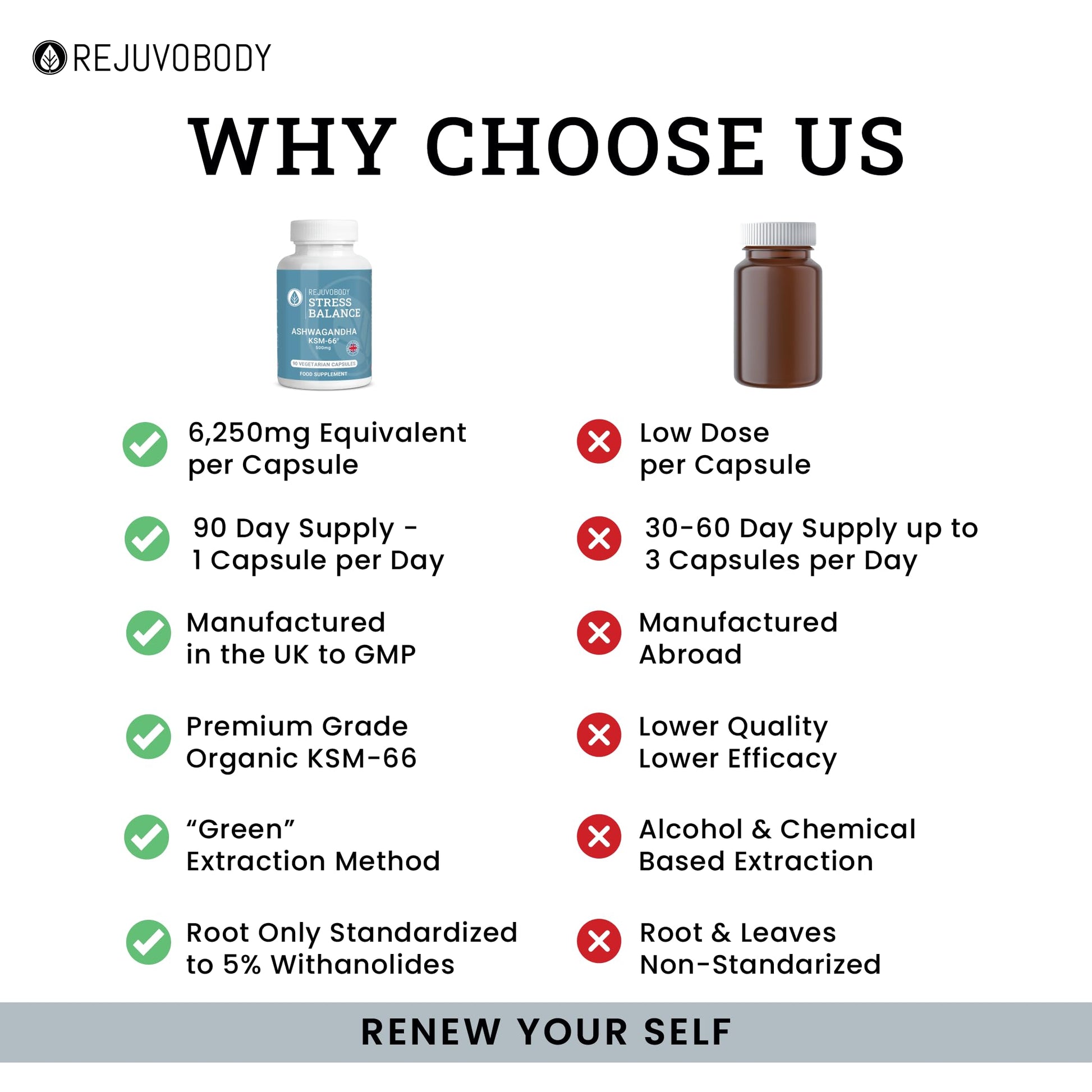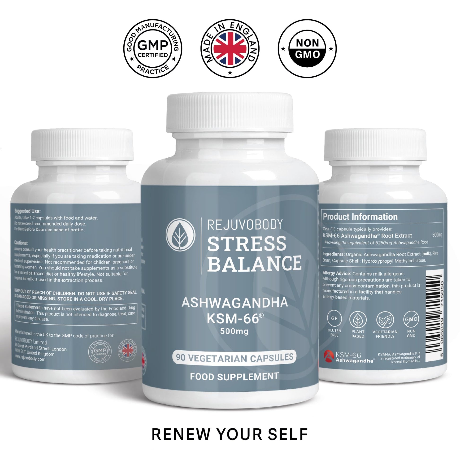 Stress Balance from RejuvoBody contains organic KSM-66 Ashwagandha which supports increased resistance to stress and anxiety. Our KSM-66 Ashwagandha is a full-spectrum extract made from only the ashwagandha root without the use of alcohol or chemical solvents. KSM-66 is one of the most clinically studied Ashwagandha root extracts available. Stress Balance KSM-66 Ashwagandha from RejuvoBody is non-GMO and suitable for vegetarians. One capsule per day provides a 500 mg dose equivalent to 6250mg of dried ashwagandha powder, standardized to 5% of withanolides.More Info