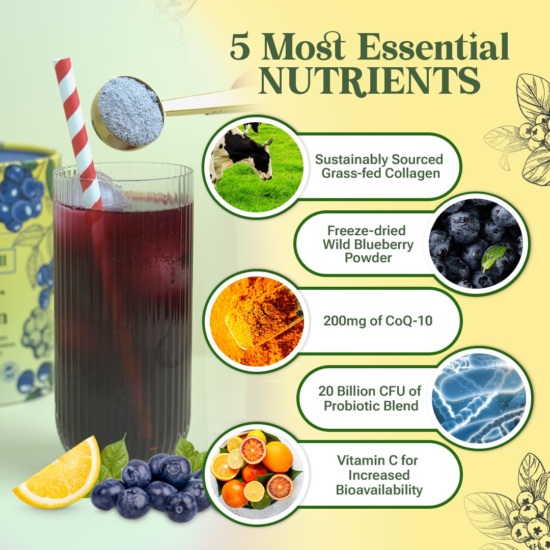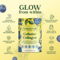 restora:cell Blueberry Cellular Collagen Powder Supplement 100% Natural Grass-fed Bovine Collagen Peptides with Vitamin C - 200 mg CoQ-10-20 Billion CFU Probiotic Blend - Paleo & Keto - 250g