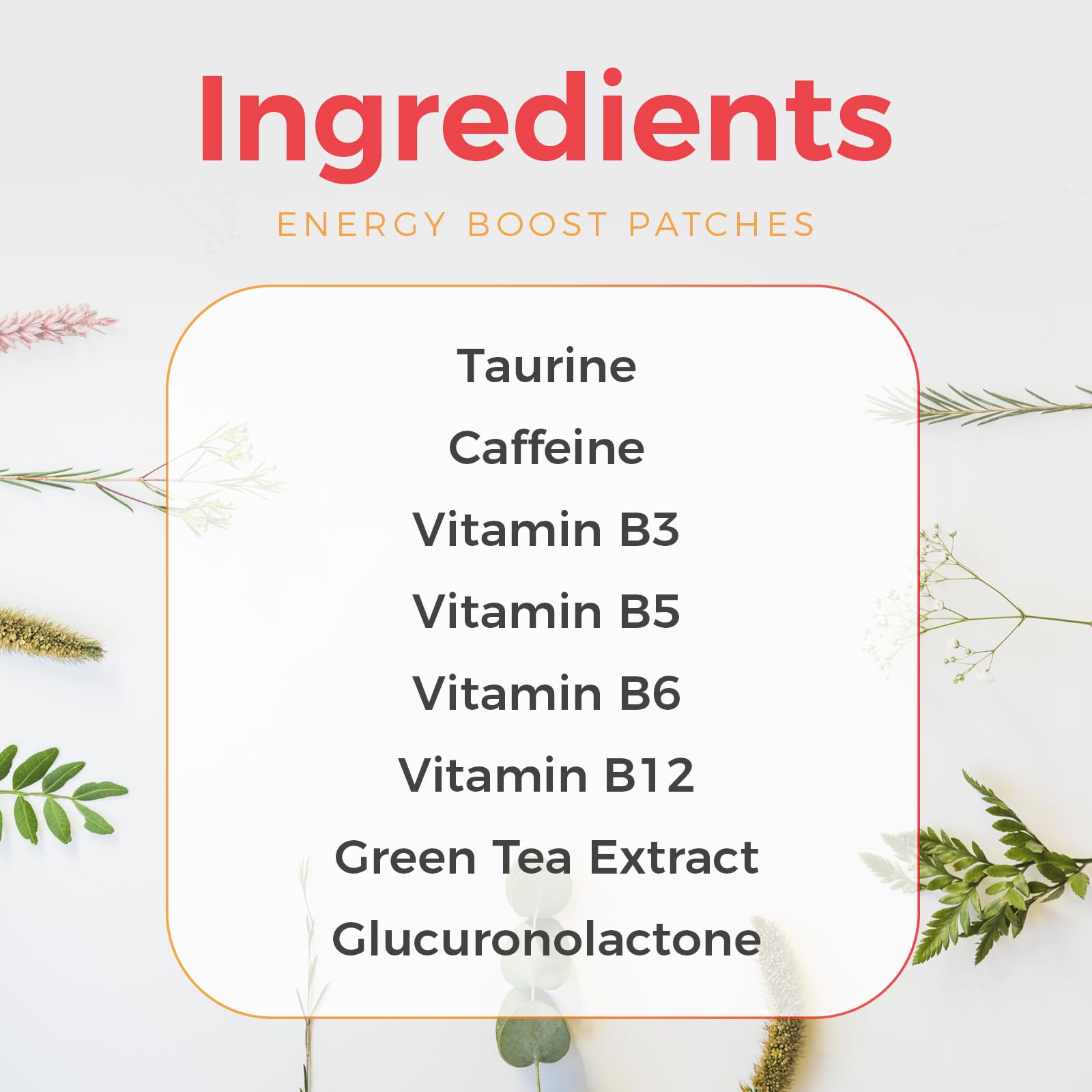 Stay energised and focused with our Energy Patches. Infused with Vitamin B12, Caffeine, and Taurine, these patches combat tiredness and provide a sustained energy boost, making them perfect for work, workouts, or busy schedules. Key Ingredients & Benefits of Our Energy Patches Taurine: Supports energy metabolism and combats tiredness, making it a vital part of these energy patches for adults. Caffeine: Provides a natural and sustained energy boost, helping you stay active and focused throughout the day. Vitamin B3 (Niacin): Enhances energy production at the cellular level, contributing to the effectiveness of these energy patches. Vitamin B5 (Pantothenic Acid): Helps reduce fatigue and supports mental performance, making it a key ingredient in these energy boosters for tiredness. Vitamin B6: Promotes brain health and energy metabolism, ensuring a steady supply of energy when you need it most. Vitamin B12: Known for its ability to boost energy levels, this essential nutrient in our B12 patches supports energy and overall vitality. Green Tea Extract: Rich in antioxidants and natural stimulants, it enhances alertness and focus for a balanced and natural energy boost. Glucuronolactone: Aids in detoxification and provides mental clarity, complementing the energy-boosting effects of our vitamin B12 patches.More Info