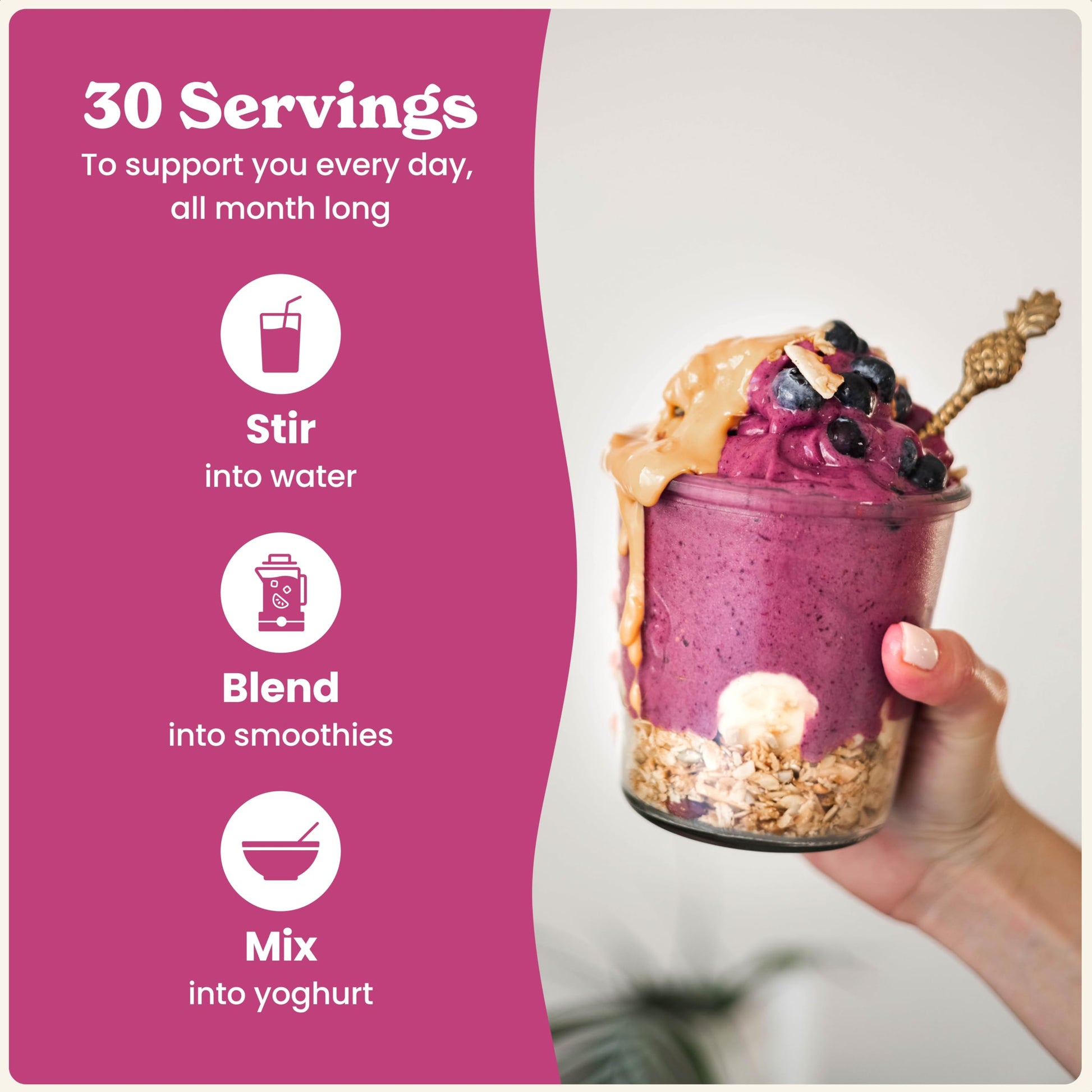 - HOW TO USE: Berry Beauty can be added to water, smoothies, juice, oats, yoghurt and other healthy recipes. Enjoy a serving every day for maximum benefits! Contains 30 servings to support you all month.